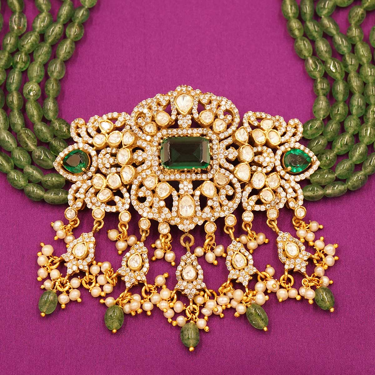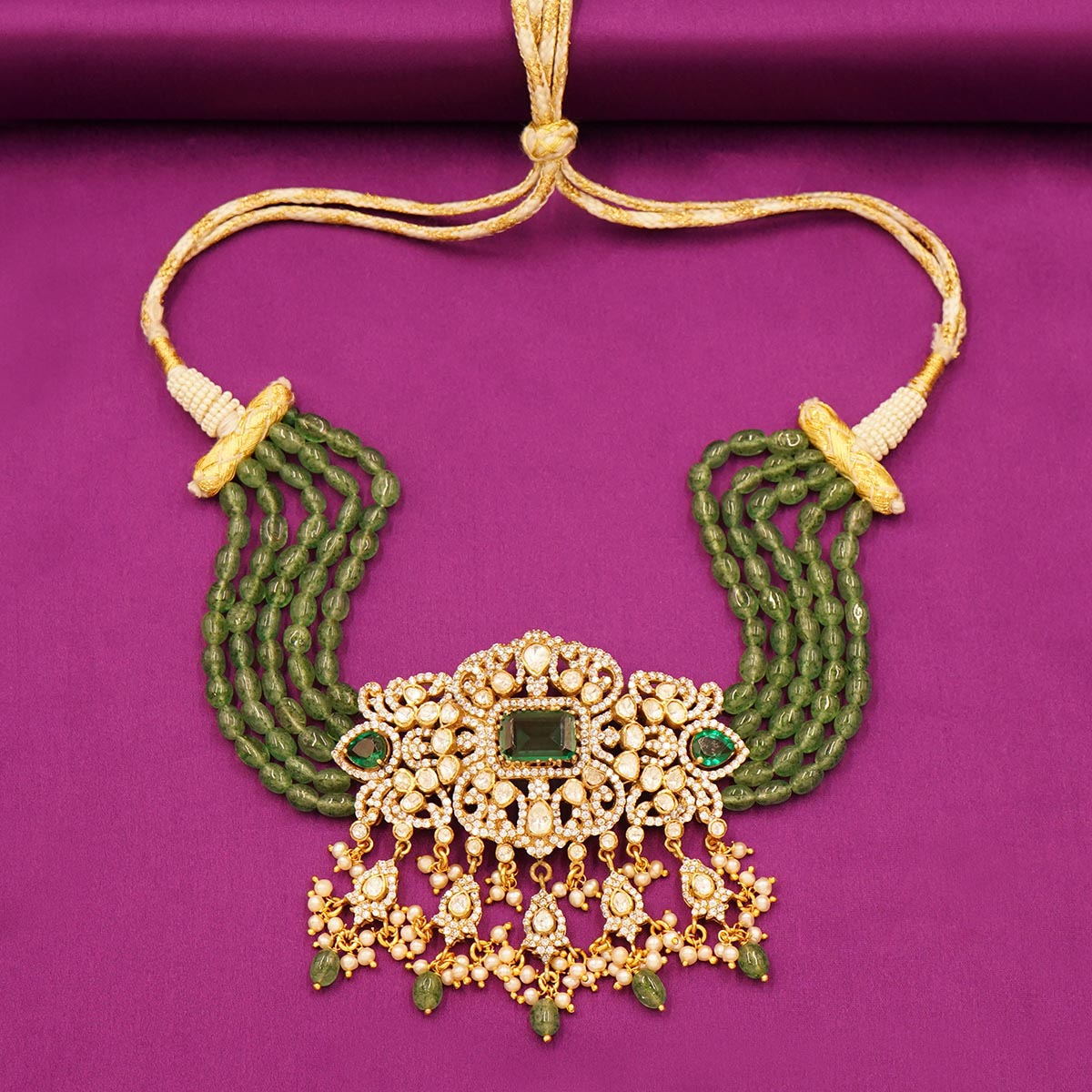 Elegant Green Beaded Silver Choker Necklace with Intricate Pendant