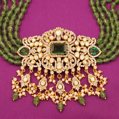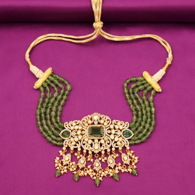 DESCRIPTION - This exquisite silver choker necklace features multiple strands of polished green beads, offering a rich and vibrant look. Perfect for formal occasions or traditional celebrations, this necklace combines classic elegance with a contemporary flair, making it a standout piece in any jewelry collection.