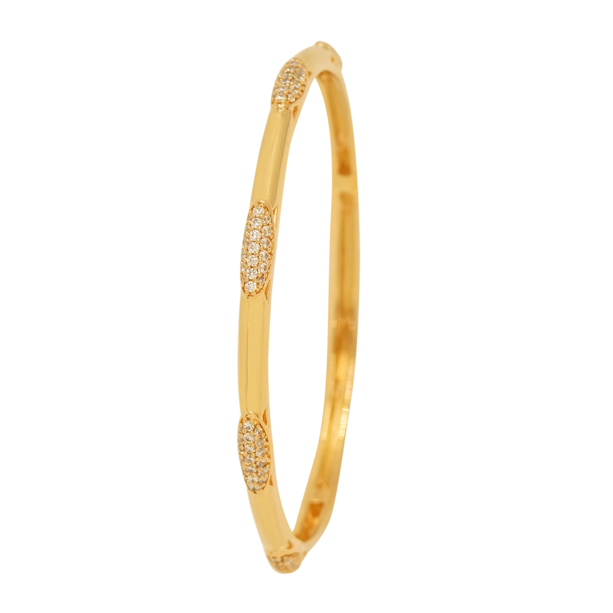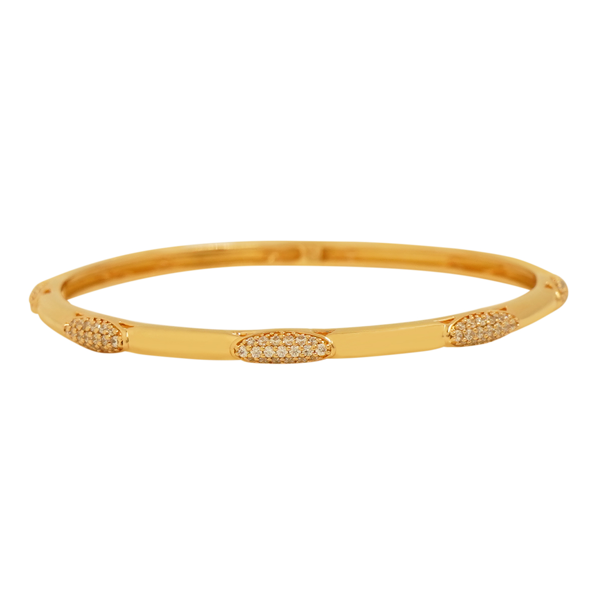 DESCRIPTION - This classy bangle pair features a smooth, sleek design highlighted with oval-shaped stone accents that add a subtle sparkle all around. perfect for both daily wear and festive occasions. A versatile pair that enhances any traditional or modern outfit with a refined, stylish touch.
