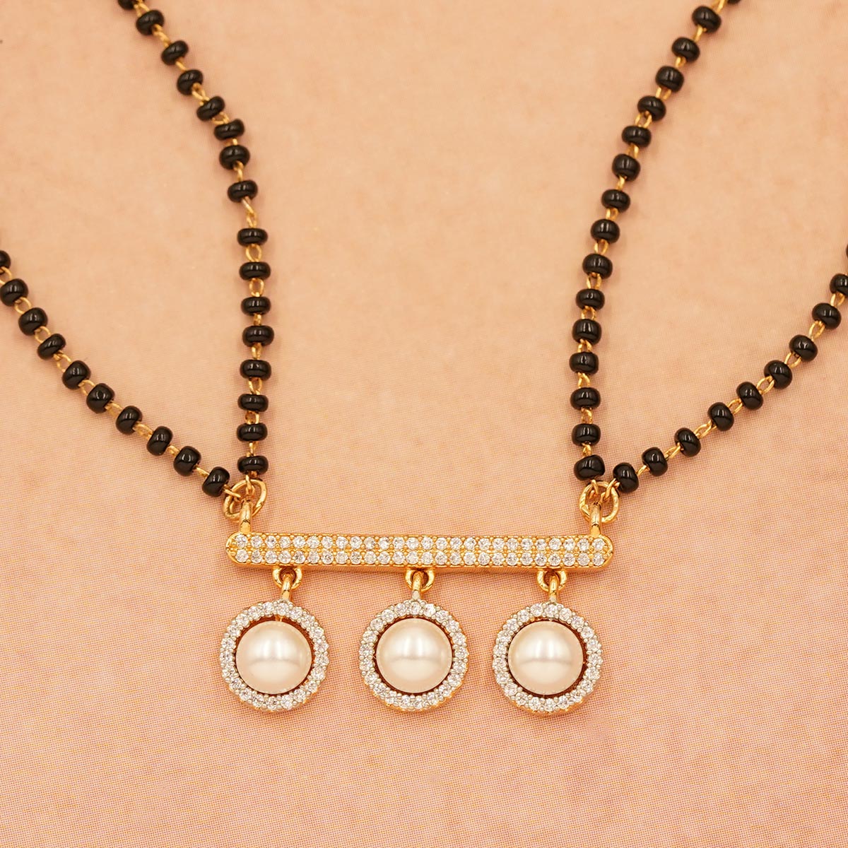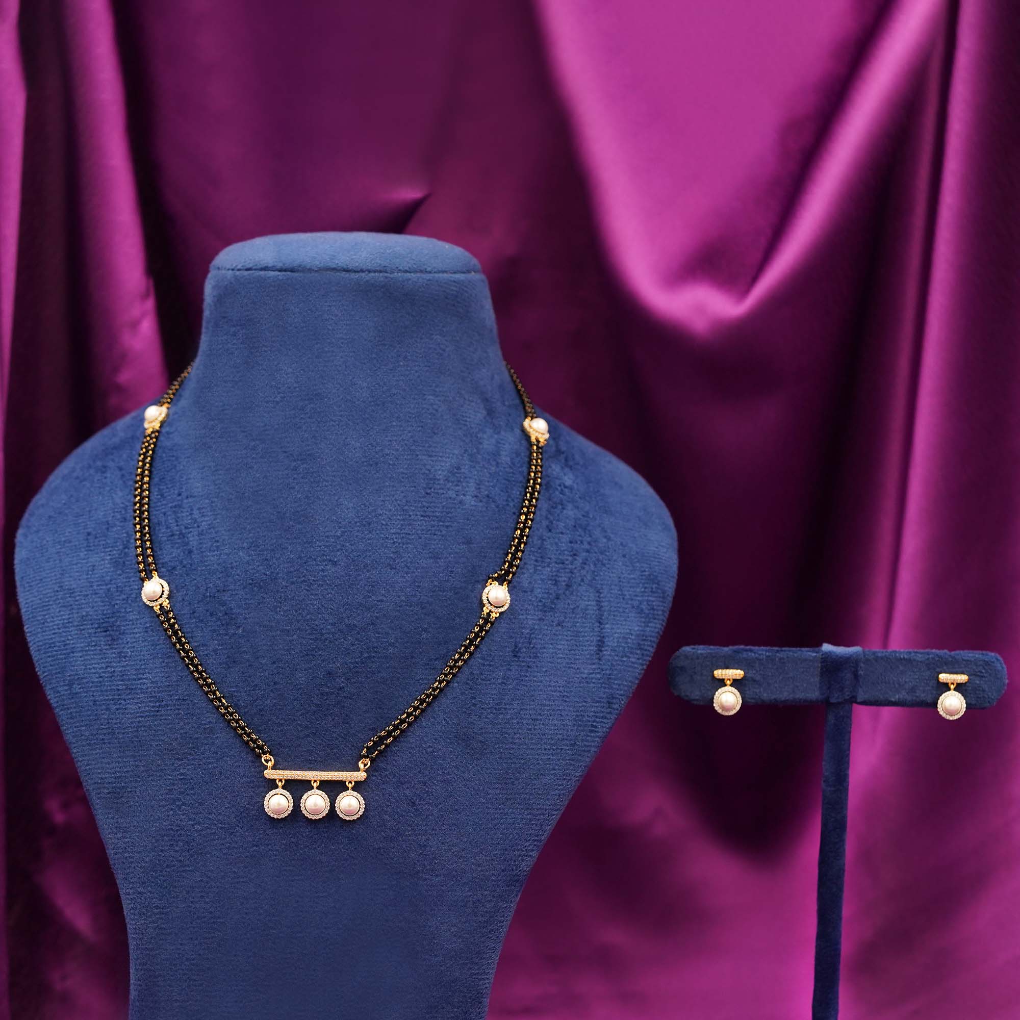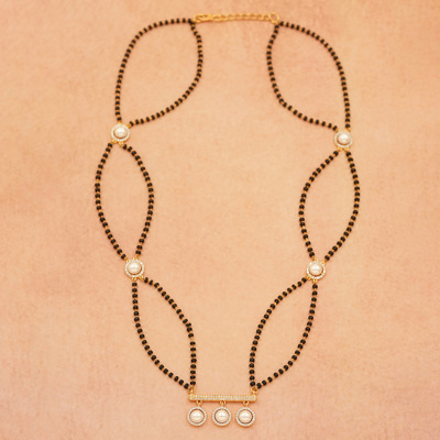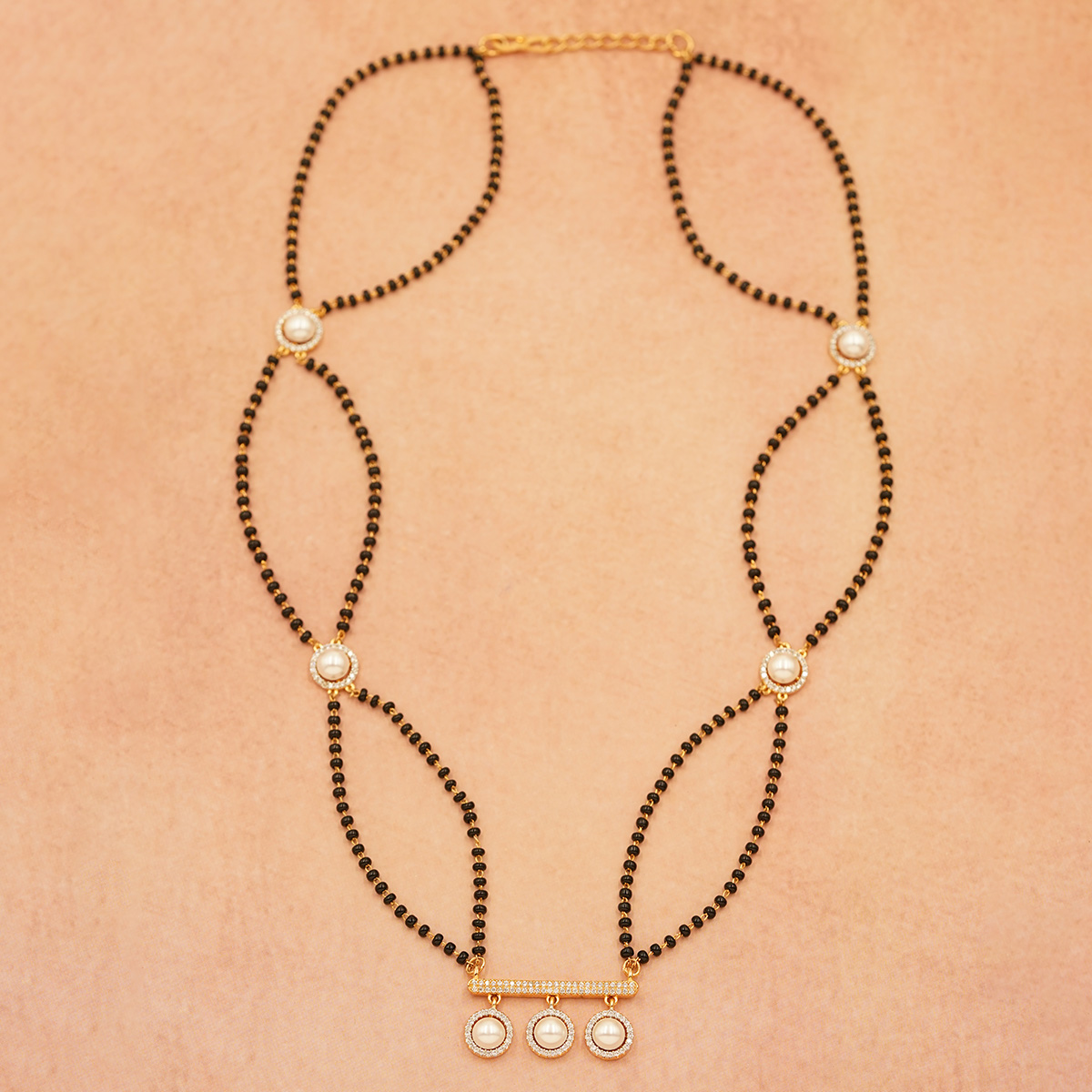 DESCRIPTION - This graceful mangalsutra set features a refined design with delicate pearl drops and a dual black bead chain. The combination of pearls and shimmering details adds a touch of sophistication to any traditional look.