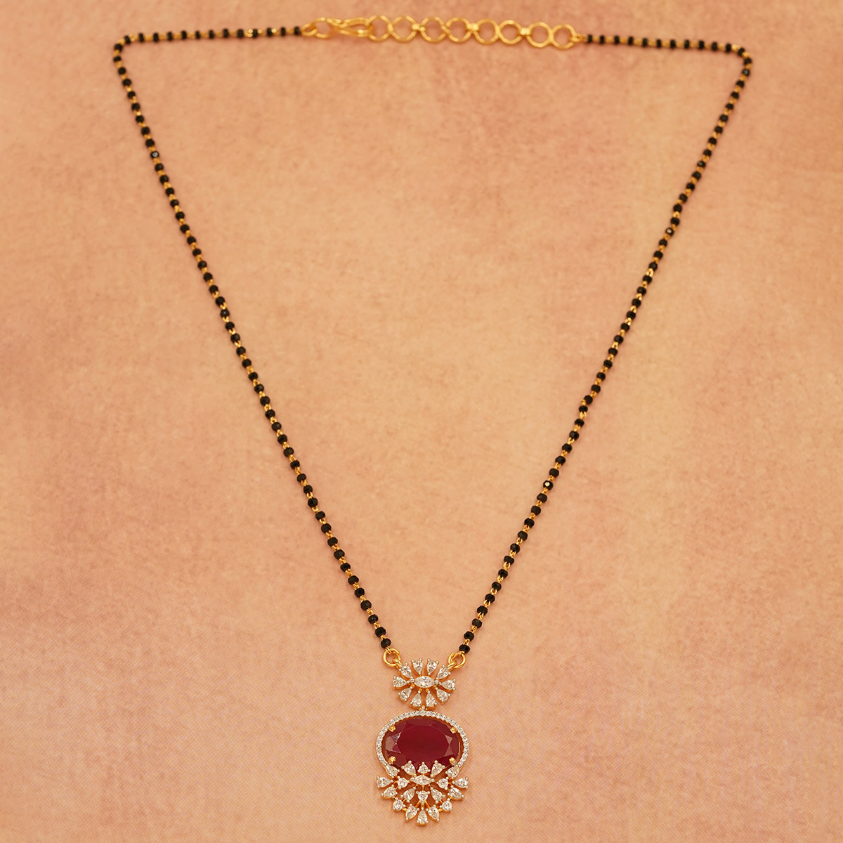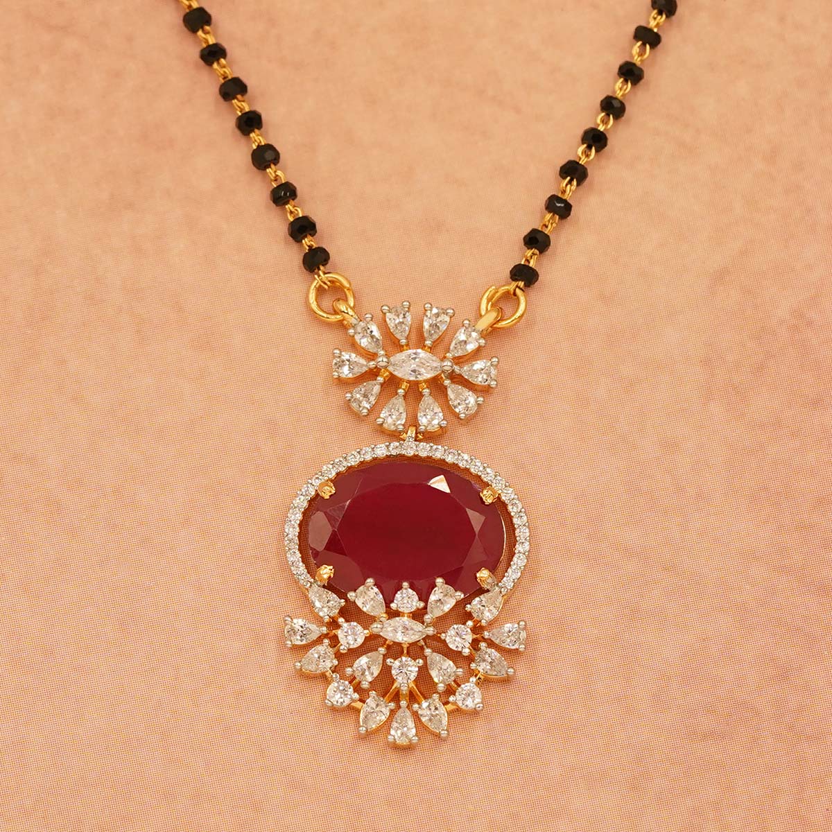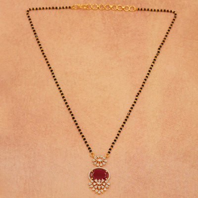 DESCRIPTION - This stunning mangalsutra features a single black bead chain with a beautifully crafted pendant showcasing a deep red stone surrounded by sparkling accents. A timeless piece that radiates grace and charm.