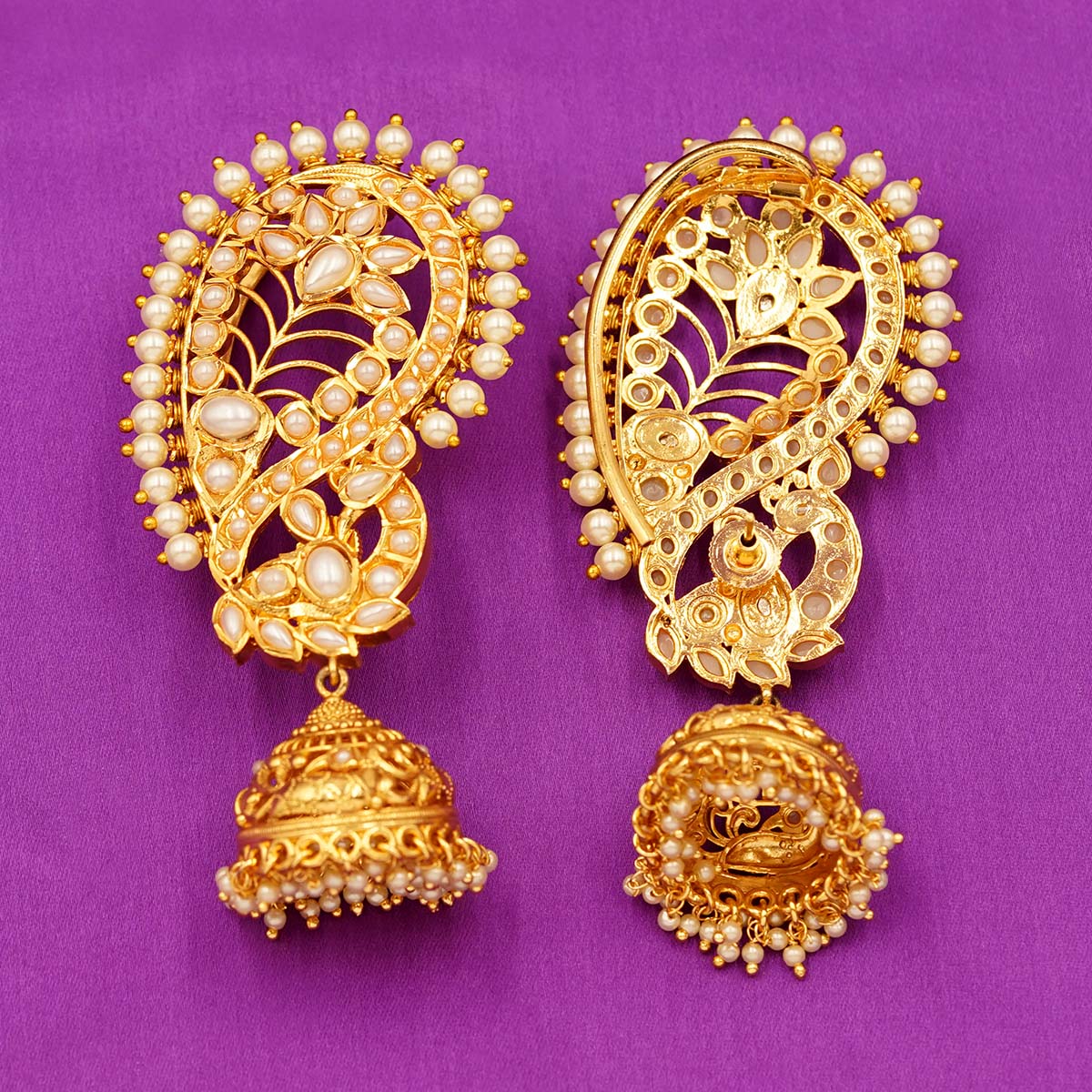 DESCRIPTION - These stunning handcrafted earrings feature intricate floral and paisley patterns adorned with shimmering stones and delicate pearls. Perfect for weddings, celebrations, or adding a regal touch to any occasion.