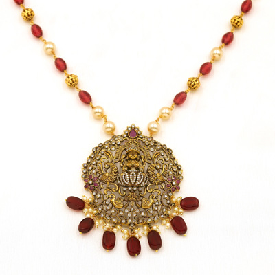 DESCRIPTION - Exuding timeless South Indian grandeur, this regal temple-style necklace set features an intricately carved Goddess Lakshmi pendant framed with traditional gold tone detailing. Accented with luminous pearls and deep ruby-hued drops, the necklace is beautifully complemented by matching chandelier earrings that mirror the ornate craftsmanship. Perfect for weddings, festive occasions, and traditional attire, this set brings divine elegance and royal charm to every ensemble.