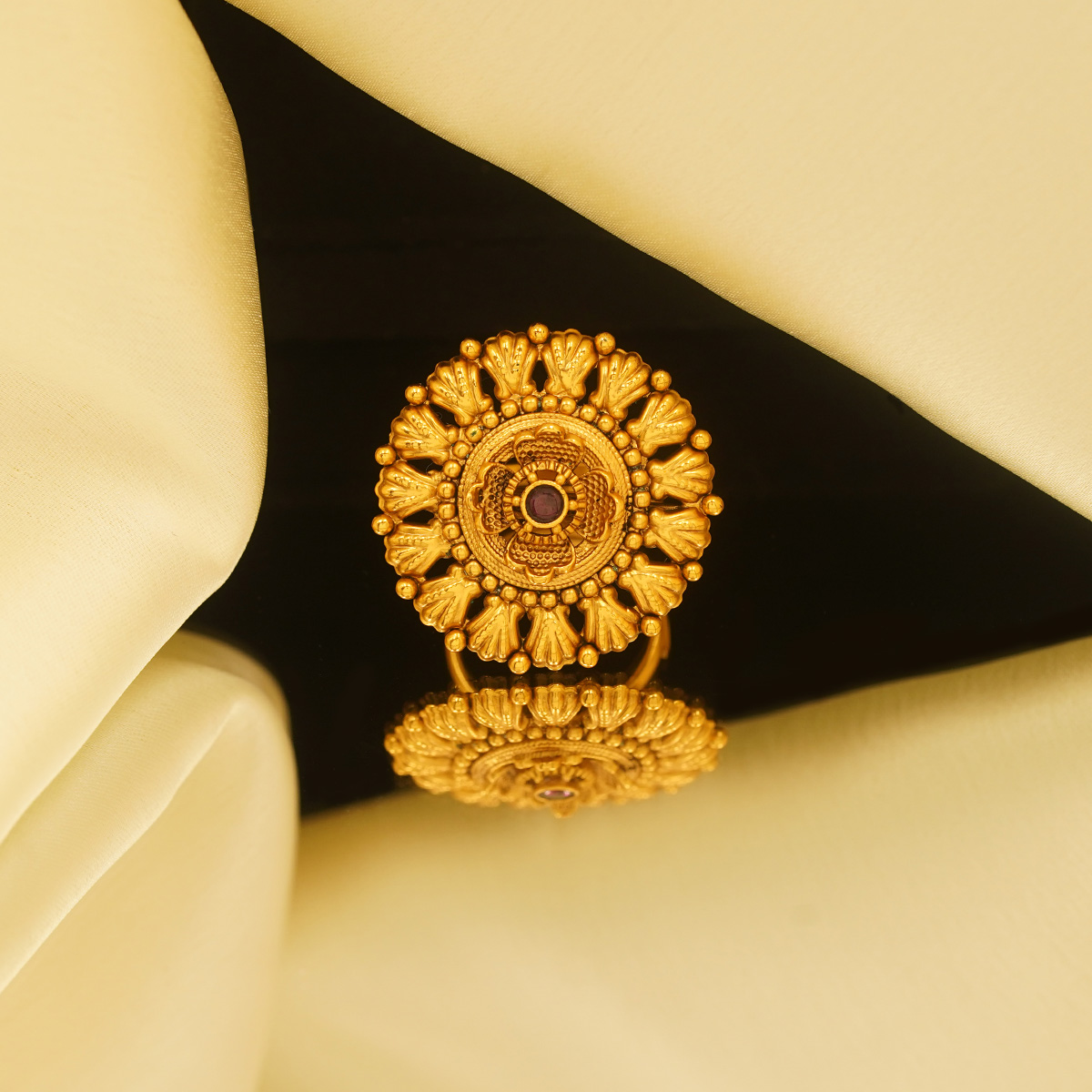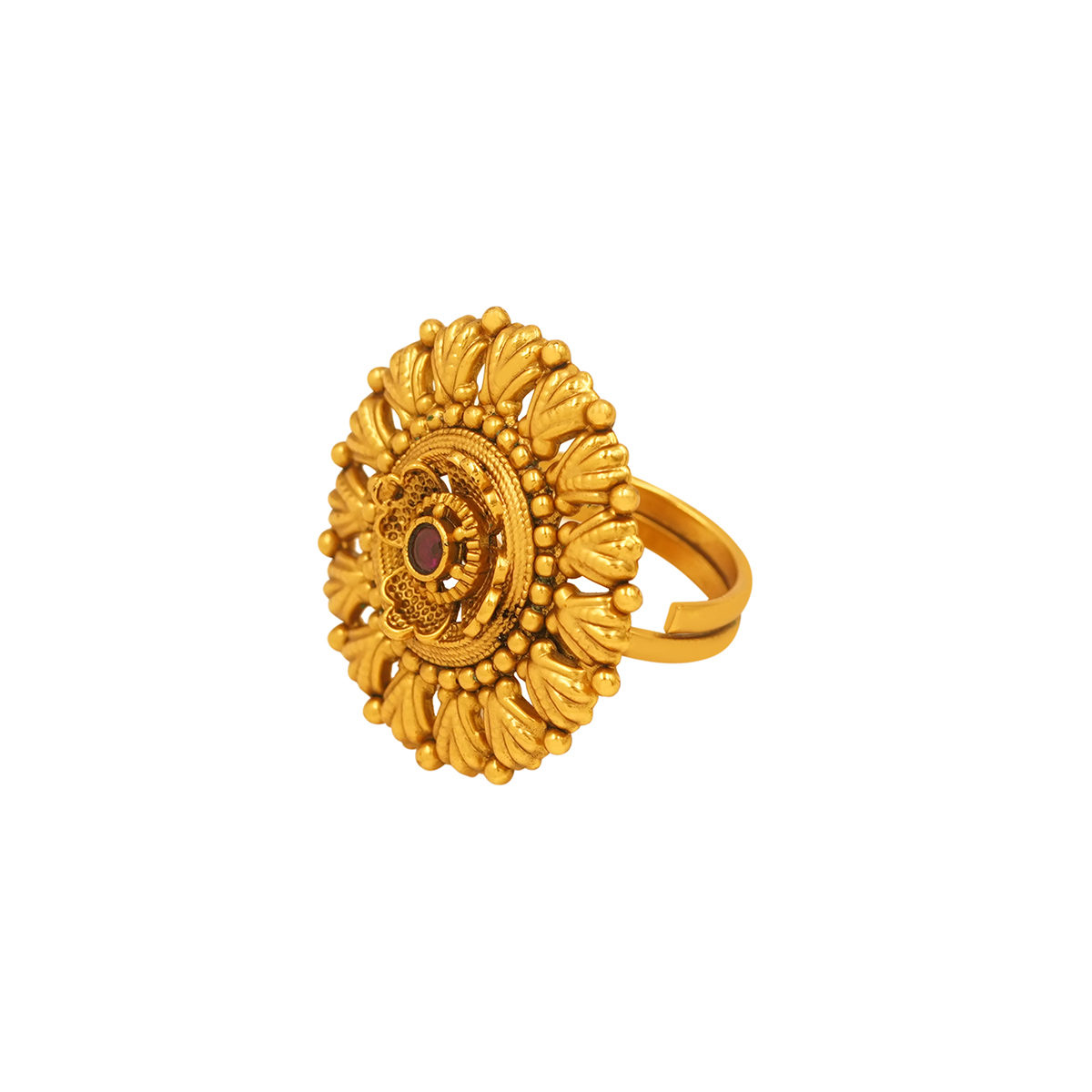 DESCRIPTION - A striking mandala-inspired gold tone ring crafted with intricate concentric detailing and radiant petal motifs. This statement piece reflects timeless Indian artistry, blending symmetry and grandeur to create a bold yet elegant accessory perfect for festive occasions and bridal ensembles.