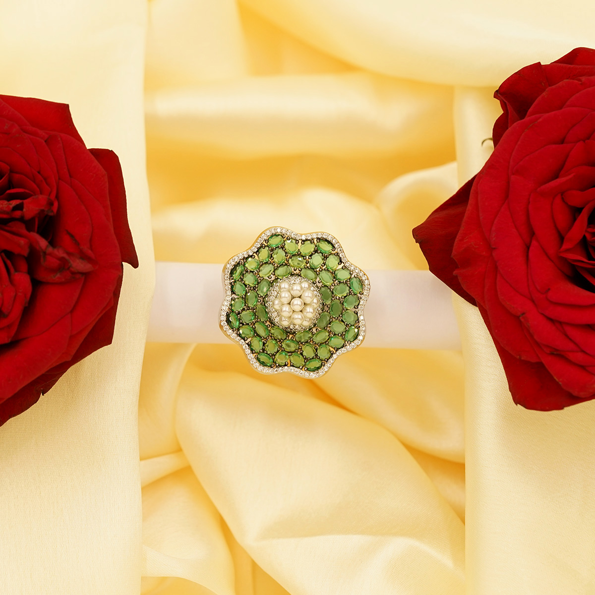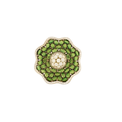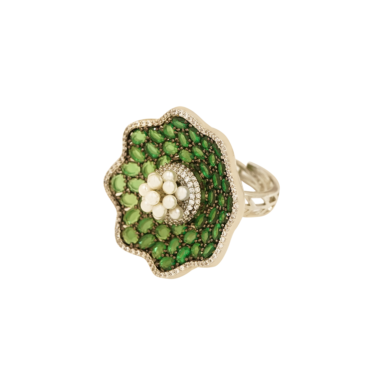 DESCRIPTION - A CAPTIVATING FUSION OF ELEGANCE AND ARTISTRY, THIS RING FEATURES A LUSH FLORAL DESIGN CRAFTED FROM RADIANT EMERALD-GREEN STONES, DELICATELY OUTLINED WITH A SHIMMERING HALO OF CLEAR CRYSTALS. AT ITS HEART BLOOMS A CLUSTER OF LUMINOUS PEARLS, ADDING A SOFT, REGAL CONTRAST TO THE VIVID GREEN PETALS. PERFECT FOR FESTIVE OCCASIONS, WEDDINGS, OR STATEMENT STYLING, THIS RING EMBODIES TIMELESS CHARM WITH A TOUCH OF MODERN GLAMOUR. A GRACEFUL PIECE THAT TRANSFORMS EVERY GESTURE INTO A MOMENT OF BEAUTY.