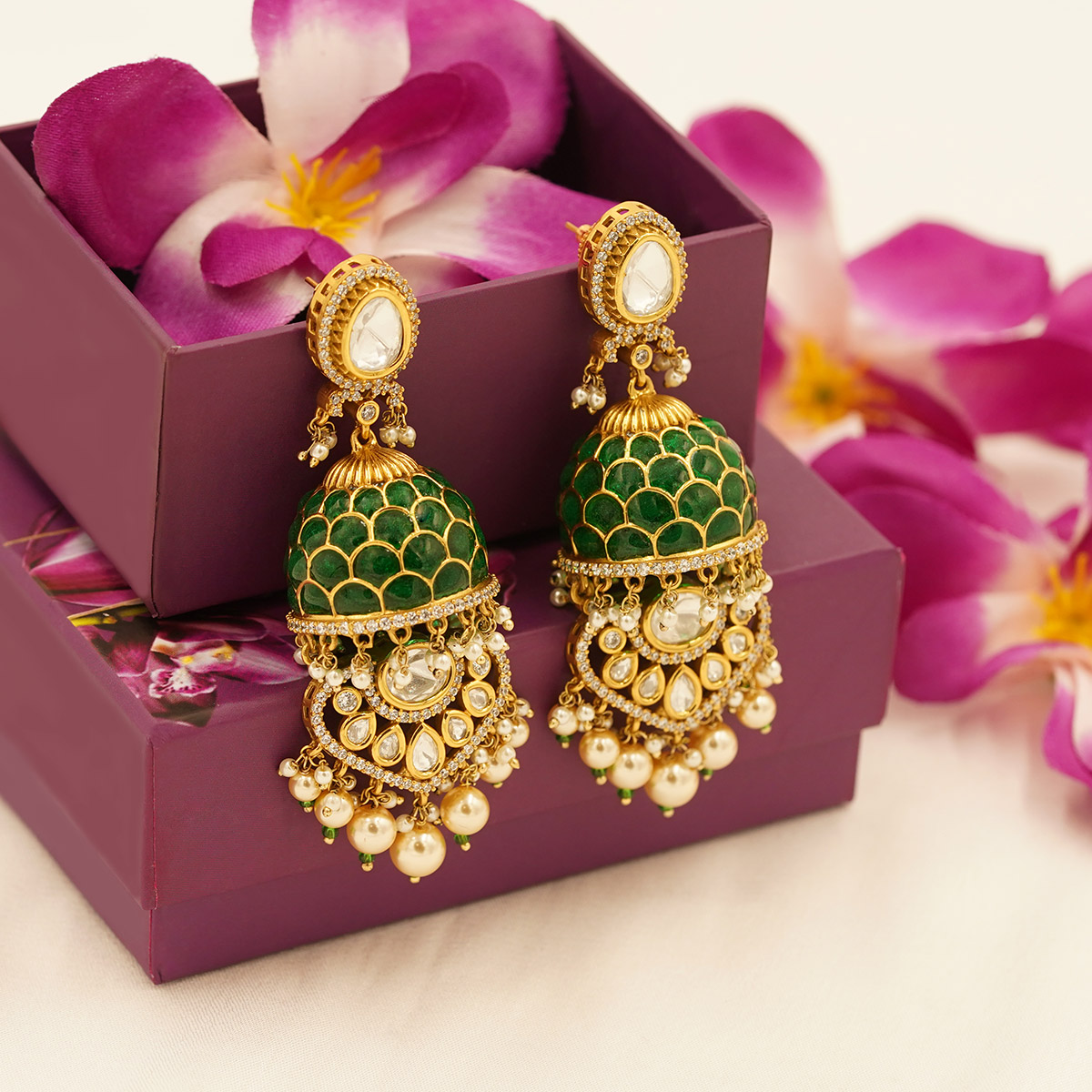 Emerald Kundan Jhumka Earrings with Pearl Drops