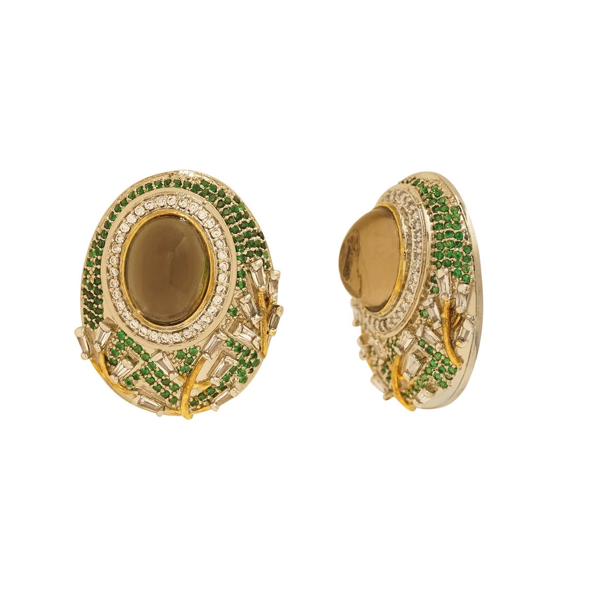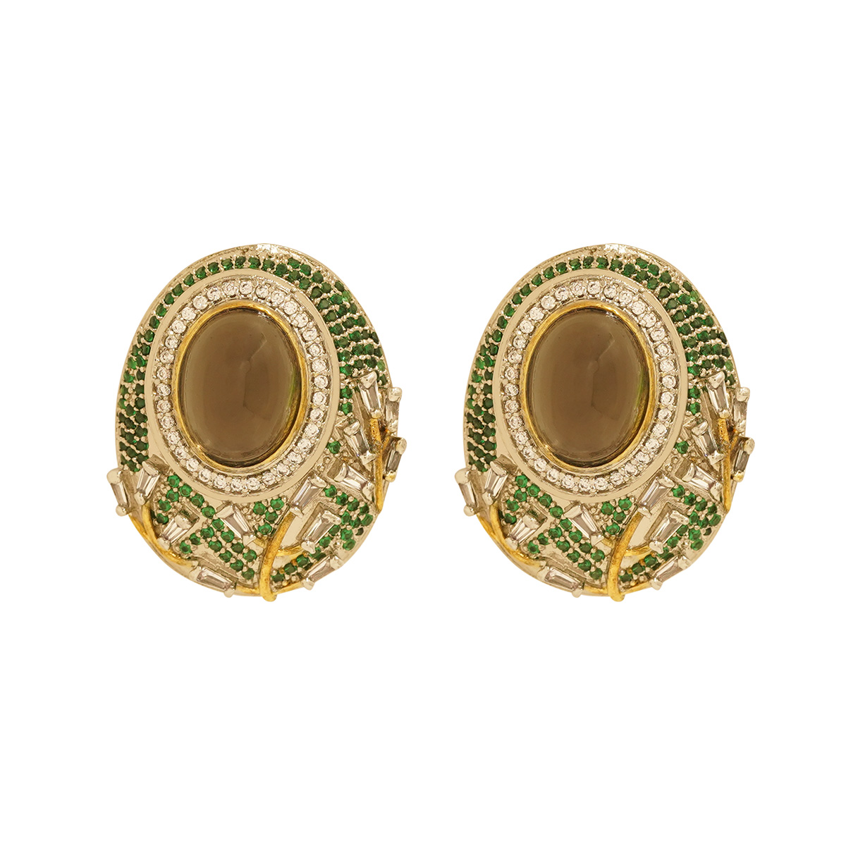 DESCRIPTION - These sophisticated oval stud earrings feature a captivating center stone surrounded by a shimmering arrangement of green and clear crystals. Perfect for adding a refined touch to any ensemble.
