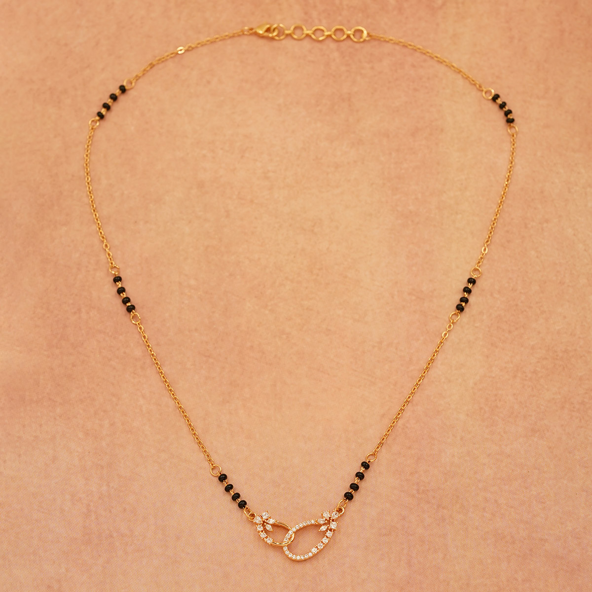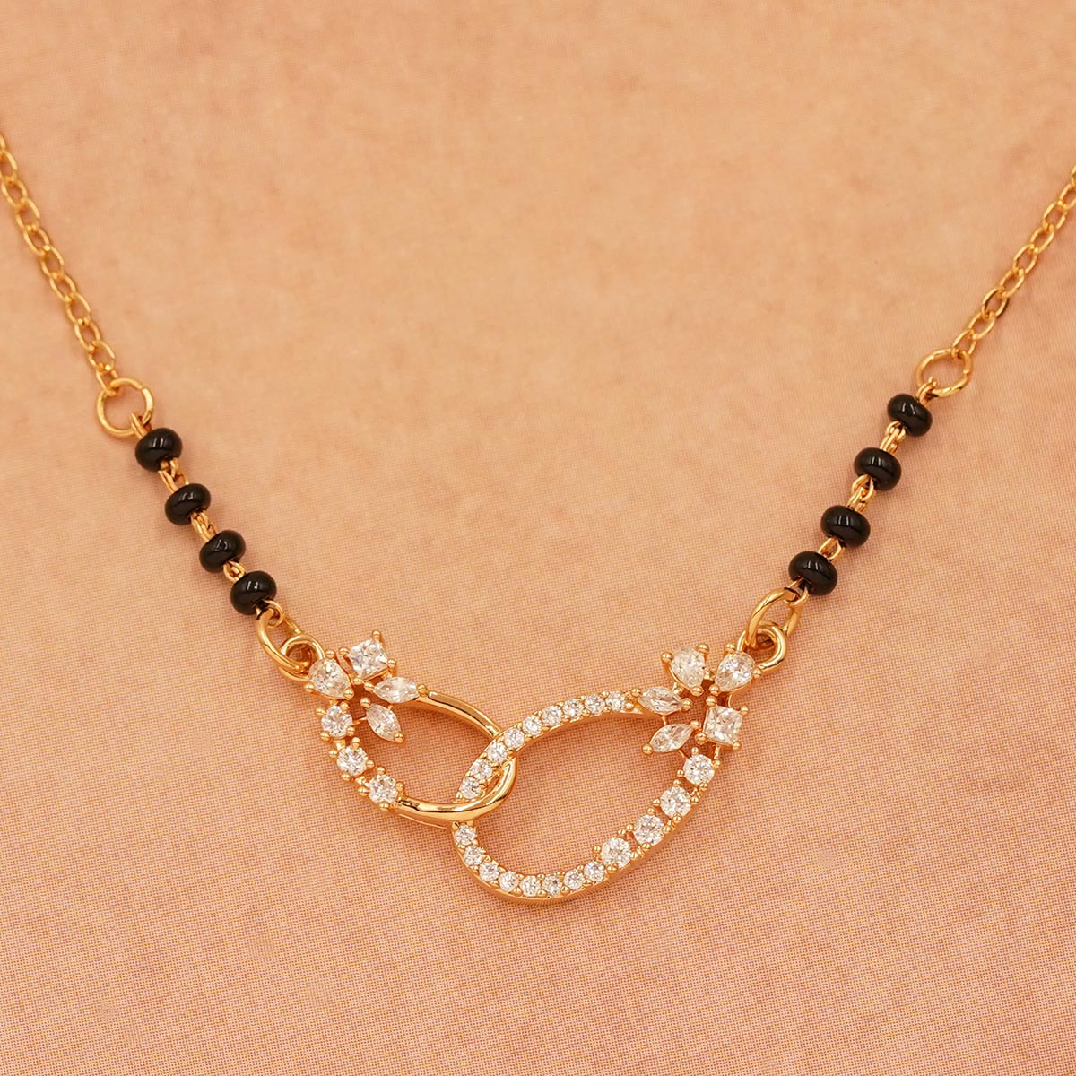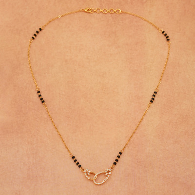 DESCRIPTION - A stunning mangalsutra crafted with a modern infinity loop pendant, symbolizing endless love and unity. The elegant black bead chain complements the sparkling stone design, making it perfect for daily wear or special occasions.