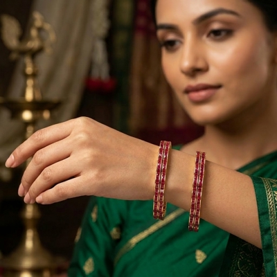 DESCRIPTION - THE IMAGE DISPLAYS TWO PAIRS OF NARROW BANGLES. THE PRIMARY COLOR IS A POLISHED GOLD TONE, LIKELY MADE FROM A BASE METAL WITH GOLD PLATING. THE DESIGN INCORPORATES SMALL, SQUARE-CUT STONES OR ENAMEL ACCENTS IN A DEEP RED OR MAROON COLOR SET ALONG THE SURFACE. THESE ARE A COMMON STYLE OF TRADITIONAL INDIAN JEWELRY (KANGAN OR CHURI), TYPICALLY WORN IN SETS FOR DAILY USE OR FESTIVE OCCASIONS.
