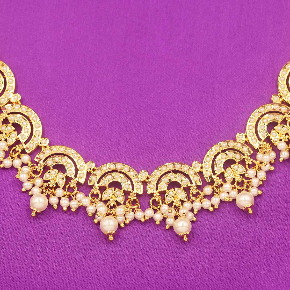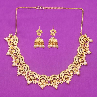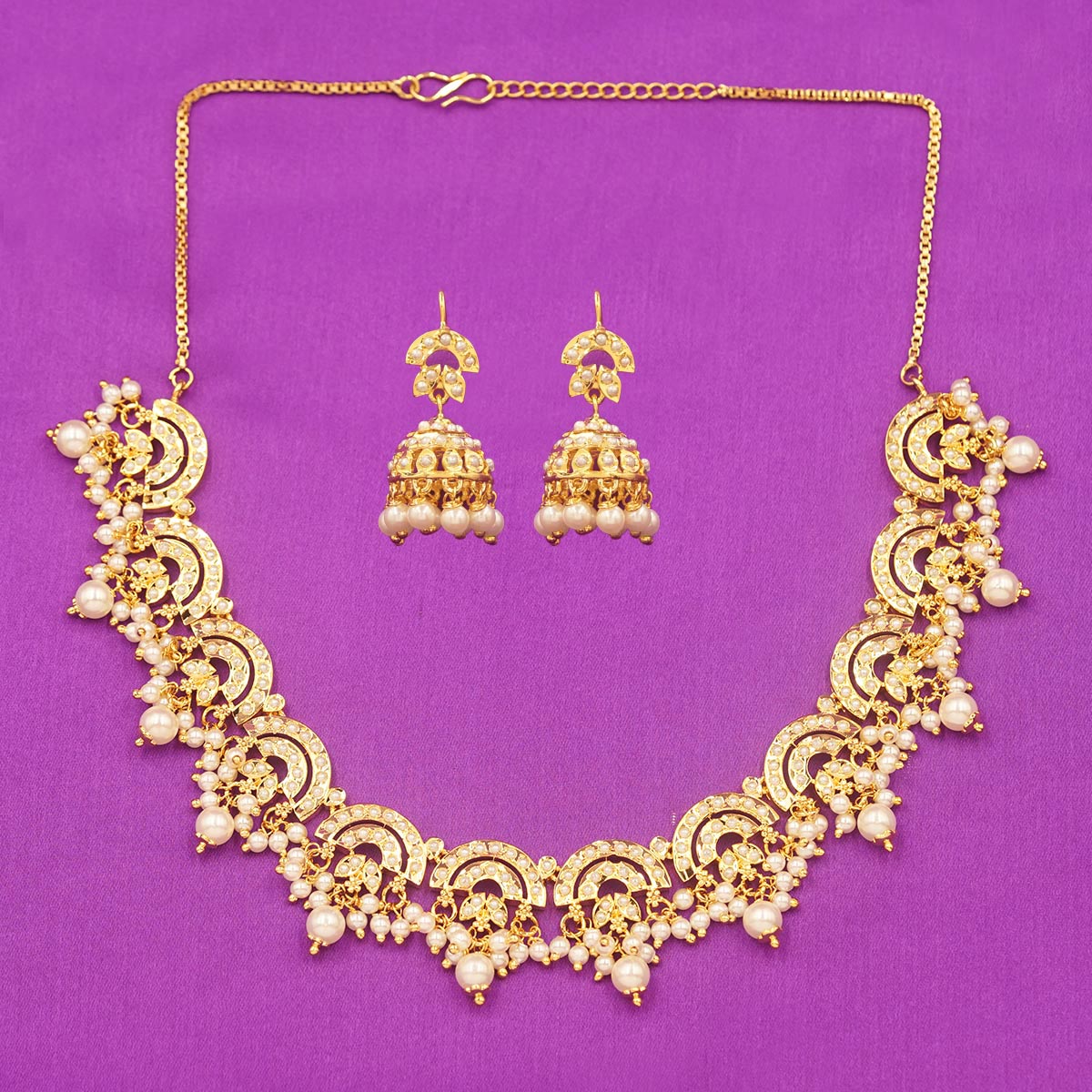 DESCRIPTION - THIS EXQUISITE CHOKER NECKLACE SET SHOWCASES A GRACEFUL ROW OF INTRICATELY CRAFTED FLORAL MOTIFS FINISHED IN RADIANT GOLD TONE. DESIGNED TO SIT ELEGANTLY ALONG THE NECKLINE, THE NECKLACE IS PAIRED WITH MATCHING JHUMKA-STYLE EARRINGS THAT ADD A TOUCH OF TRADITIONAL CHARM. PERFECT FOR WEDDINGS, FESTIVE OCCASIONS, AND CULTURAL CELEBRATIONS, THIS SET BLENDS CLASSIC ARTISTRY WITH TIMELESS ELEGANCE, MAKING IT A BEAUTIFUL STATEMENT PIECE FOR ANY ETHNIC OR FUSION ENSEMBLE.
