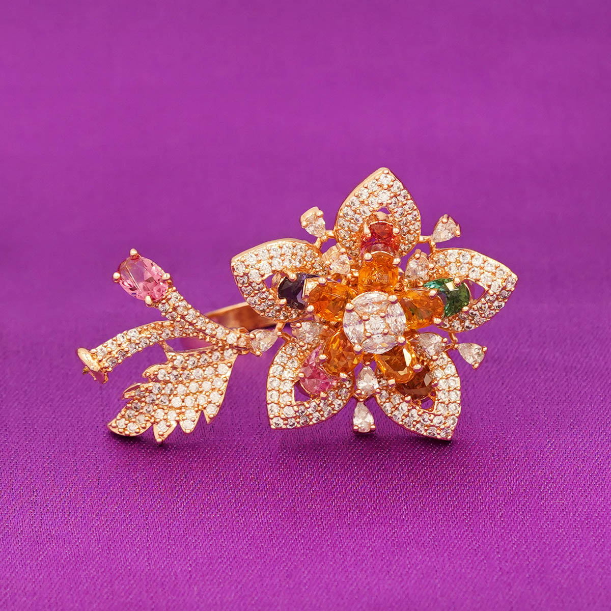 DESCRIPTION - This luxurious cocktail ring blooms with a dazzling arrangement of golden, pink, and multicolor stones set in a radiant gold finish. The intricate layered design and pavé detailing add exceptional sparkle, making it a standout statement piece. Perfect for weddings, parties, and grand festive looks that demand pure elegance.