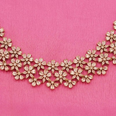 DESCRIPTION - Radiate elegance with this Golden Blossom Sparkle Necklace Set, beautifully crafted with intricate floral motifs and shimmering stones. festive occasions, or elegant evening looks. Lightweight, non-metal, and timeless — this floral-inspired design brings effortless charm to every outfit.
