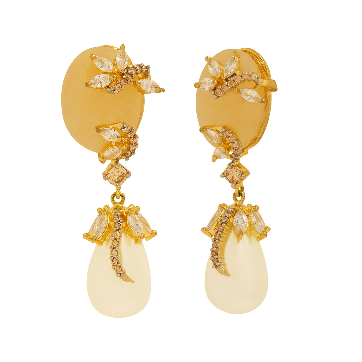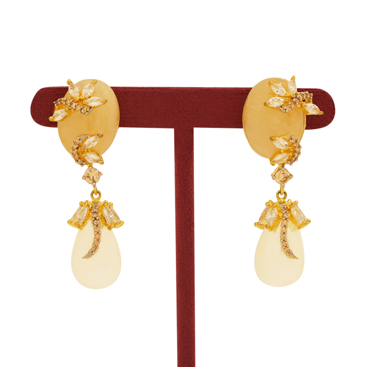 DESCRIPTION - These exquisite earrings feature a warm golden-toned gemstone paired with a lustrous pearl drop, adorned with delicate crystal-studded leaf motifs. A refined statement piece that beautifully combines elegance and charm.
