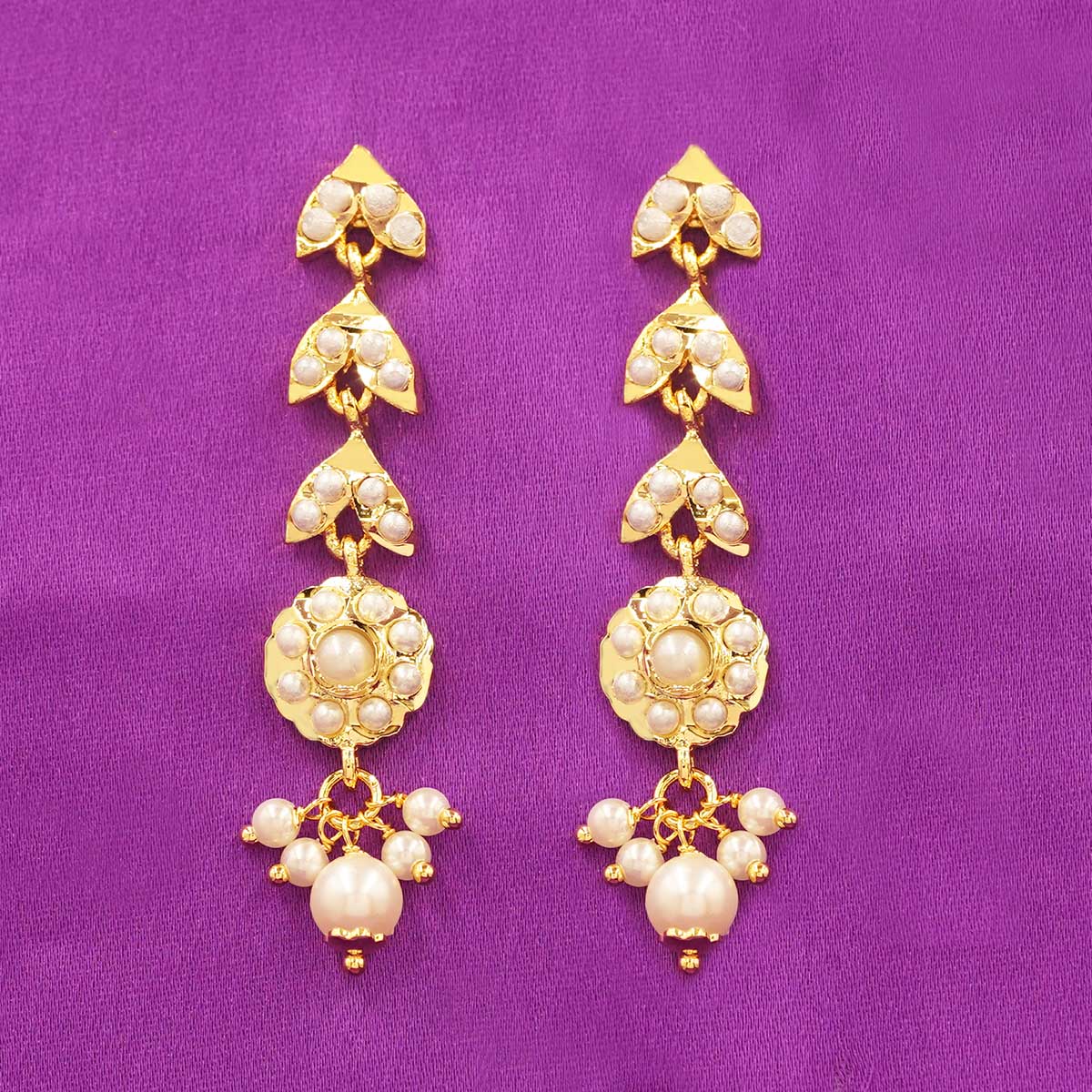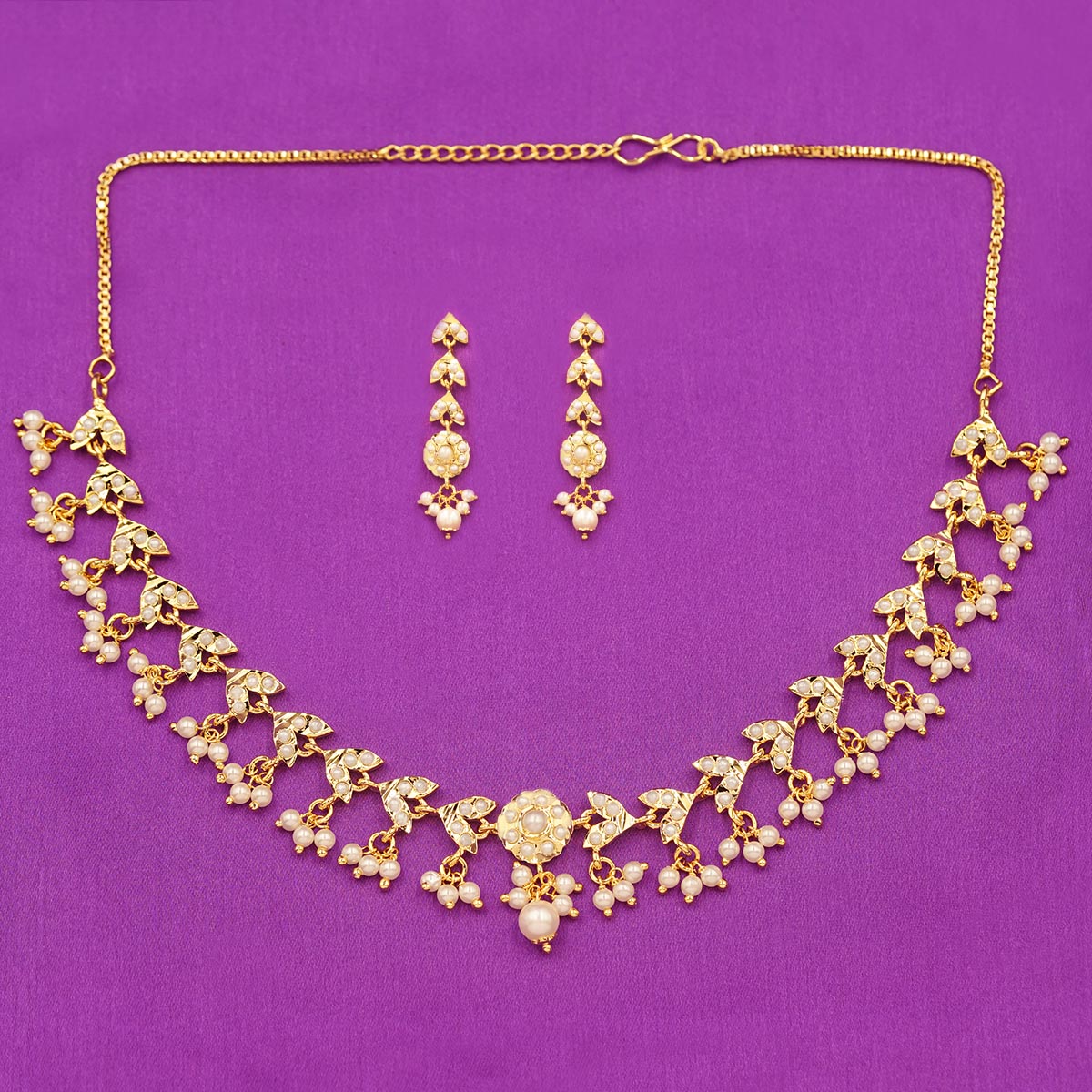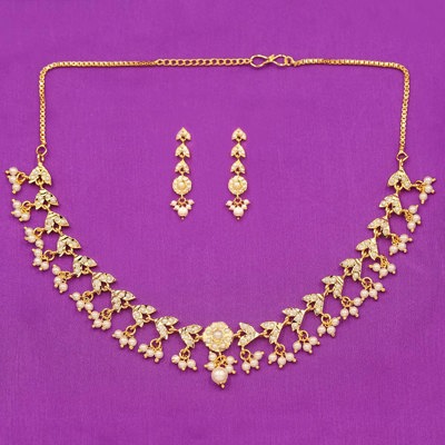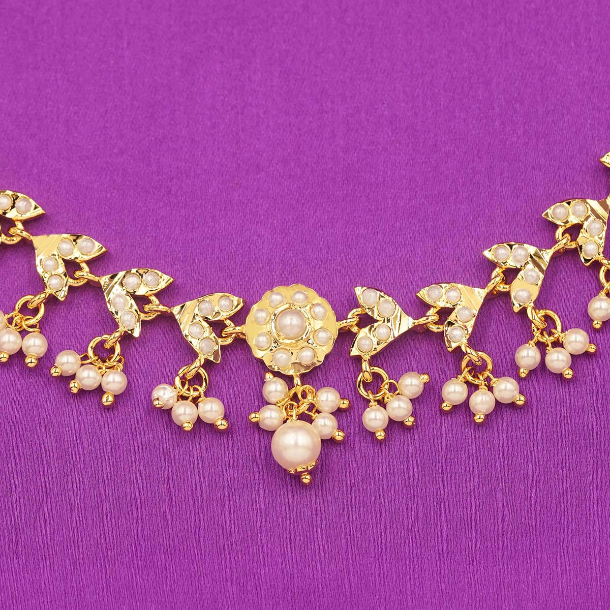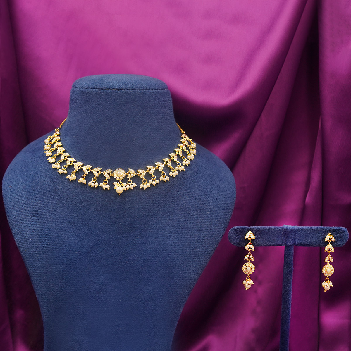 DESCRIPTION - THIS ELEGANT CHOKER SET FEATURES A DELICATE ROW OF GOLD-TONED FLORAL MOTIFS, CRAFTED TO SIT GRACEFULLY ALONG THE NECKLINE. THE INTRICATE DETAILING AND WARM FINISH GIVE IT A TIMELESS CHARM, WHILE THE MATCHING DROP EARRINGS ADD A TOUCH OF REFINED SPARKLE.