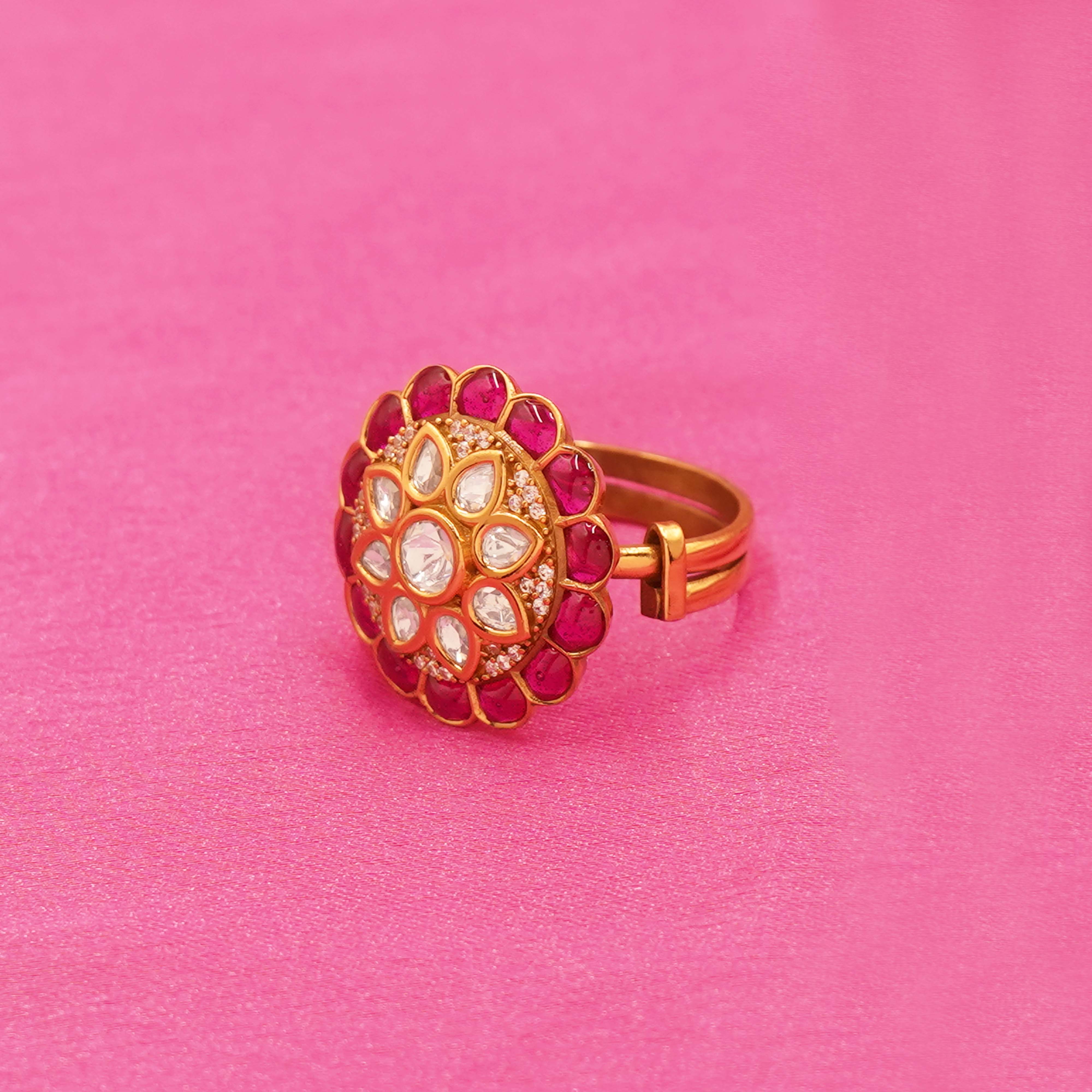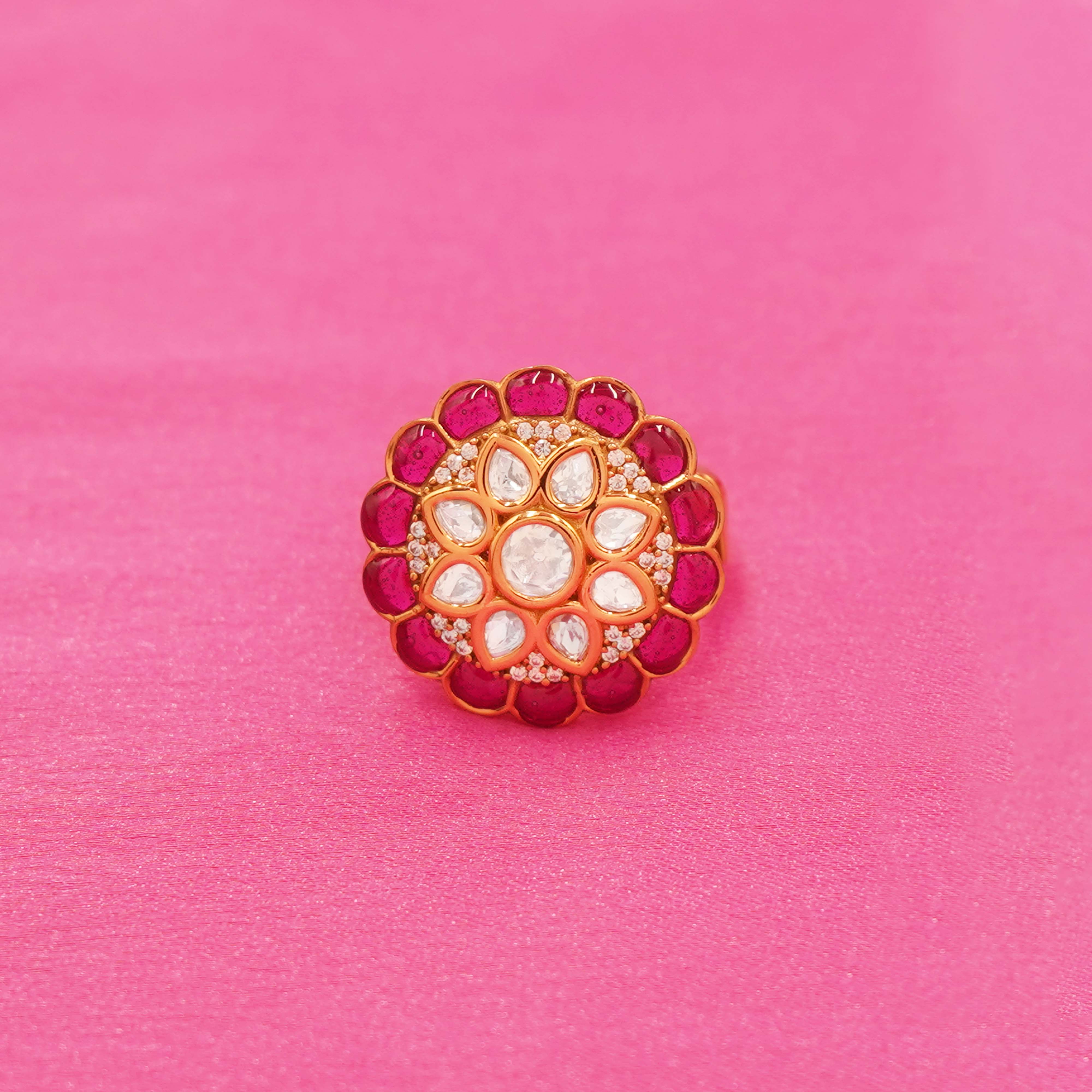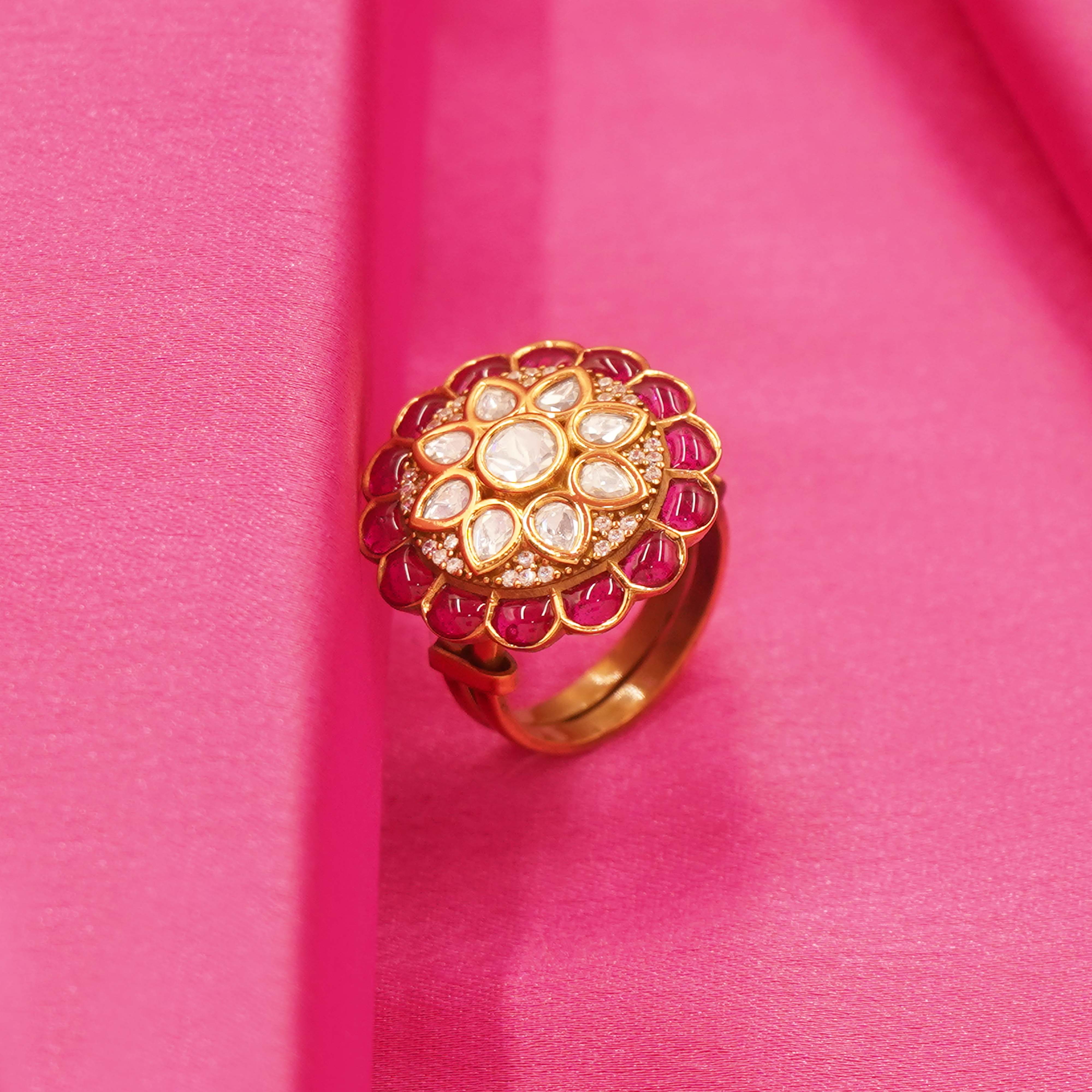 DESCRIPTION - ELEGANT IMPRESSION WITH THIS GOLDEN TONE BLOSSOM STATEMENT RING. CRAFTED IN A RICH GOLD-TONE FINISH, THE RING FEATURES A BEAUTIFULLY DETAILED FLORAL DESIGN ACCENTED WITH SHIMMERING STONES AT THE CENTER, CREATING A RADIANT FOCAL POINT. ITS INTRICATE CRAFTSMANSHIP AND SMOOTH BAND ENSURE BOTH COMFORT AND STANDOUT STYLE, MAKING IT PERFECT FOR FESTIVE OCCASIONS, WEDDINGS, OR ELEVATING EVERYDAY ETHNIC AND FUSION LOOKS. A TIMELESS PIECE THAT ADDS GRACE AND GLAMOUR TO ANY JEWELRY COLLECTION.