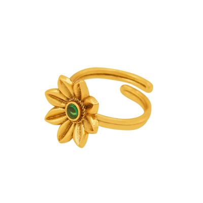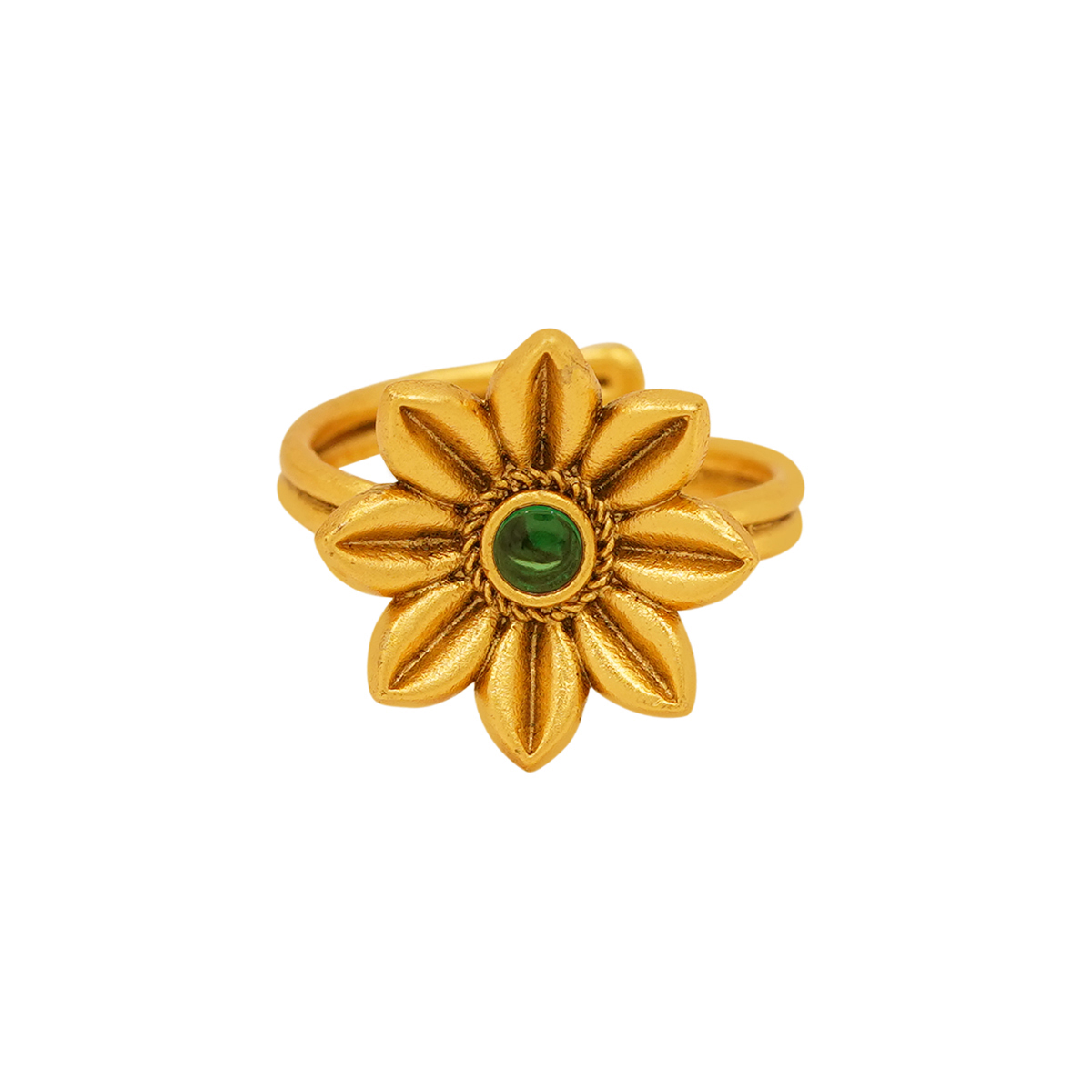 DESCRIPTION - THE GOLDEN TONE EMERALD SUNBURST RING FEATURES A VIBRANT GREEN CENTER STONE ENCIRCLED BY DELICATELY SCULPTED GOLD TONE PETALS. INSPIRED BY THE BEAUTY OF BLOOMING FLOWERS AND THE WARMTH OF SUNLIGHT, THIS RING BRINGS TOGETHER NATURE’S CHARM AND CLASSIC CRAFTSMANSHIP. ITS LUMINOUS GOLD TONE FINISH AND RICH EMERALD TONE MAKE IT A PERFECT STATEMENT PIECE FOR FESTIVE OCCASIONS, WEDDINGS, OR EVERYDAY LUXURY. DESIGNED TO CAPTURE ATTENTION WHILE REMAINING GRACEFULLY REFINED, THIS RING IS A CELEBRATION OF BEAUTY, BALANCE, AND BRILLIANCE.