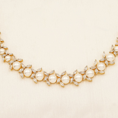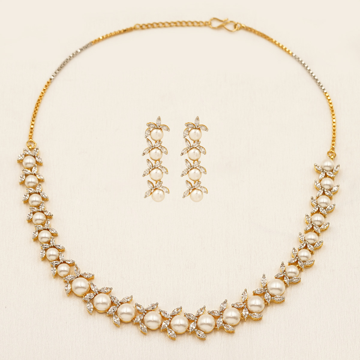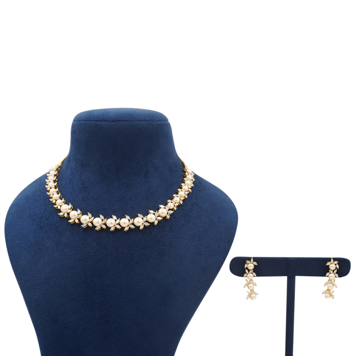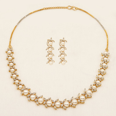 DESCRIPTION - A DELICATE GOLD-TONE CHOKER ADORNED WITH TINY FLORAL MOTIFS AND SOFT PEARL ACCENTS, PAIRED WITH MATCHING DROP EARRINGS FOR A PERFECTLY COORDINATED LOOK. THE CLOSE-FIT DESIGN HIGHLIGHTS THE NECKLINE WHILE THE SUBTLE SHIMMER ADDS ELEGANCE WITHOUT OVERPOWERING.