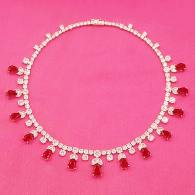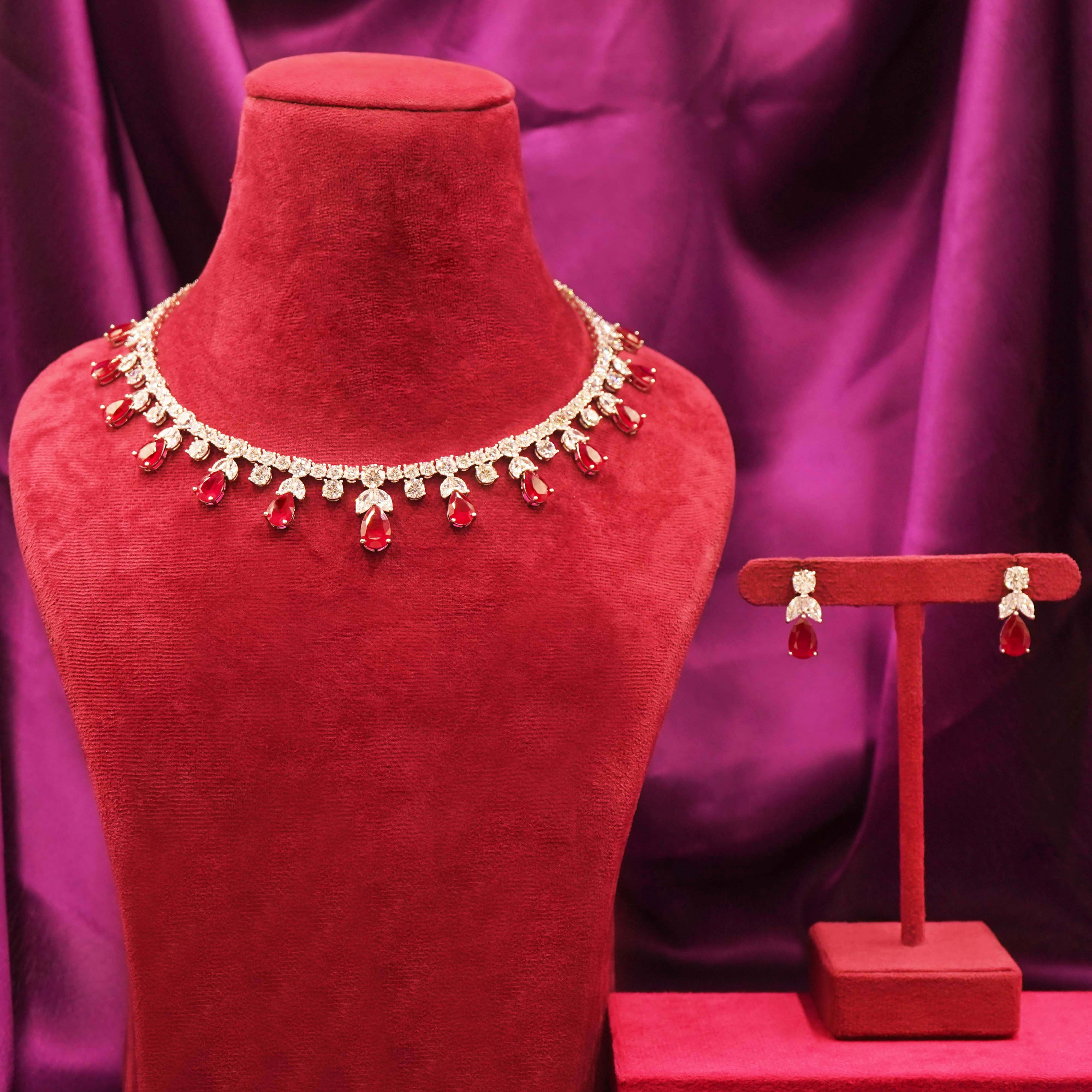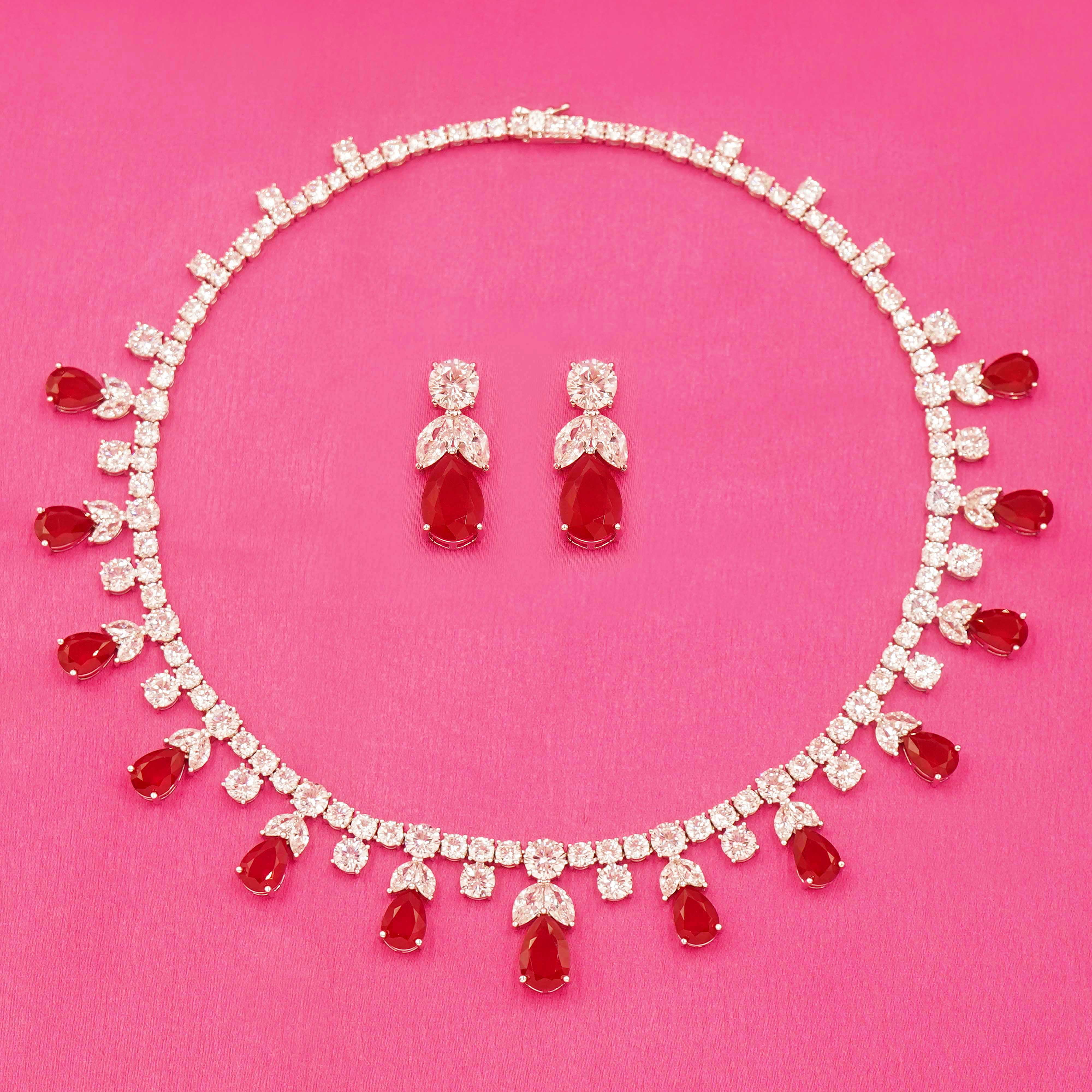 DESCRIPTION - This elegant necklace set is beautifully designed with red drop stones and sparkling white accents, giving it a graceful festive look. Ideal for weddings, parties, and traditional occasions, this jewellery set is a stylish accessory to enhance any outfit.