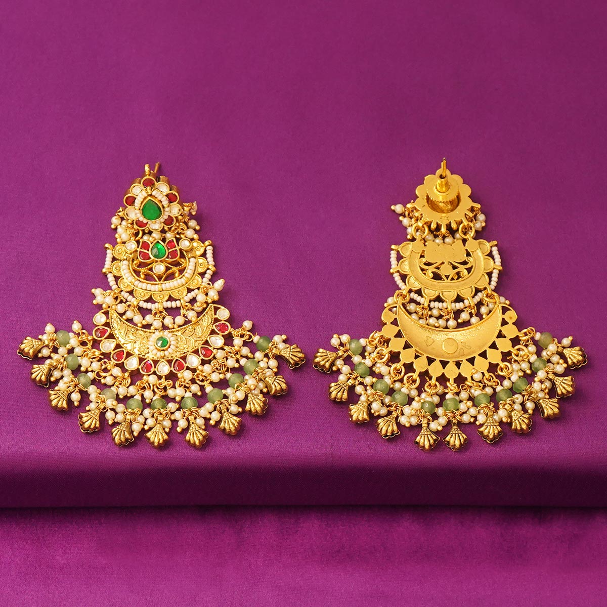 DESCRIPTION - Make a royal statement with these Grand Kundan & Pearl Chandbali Earrings, designed to radiate timeless elegance and luxury. Featuring intricate floral and crescent motifs, these earrings are embellished with green stones, pearls, and delicate Kundan work — a masterpiece of traditional craftsmanship.
