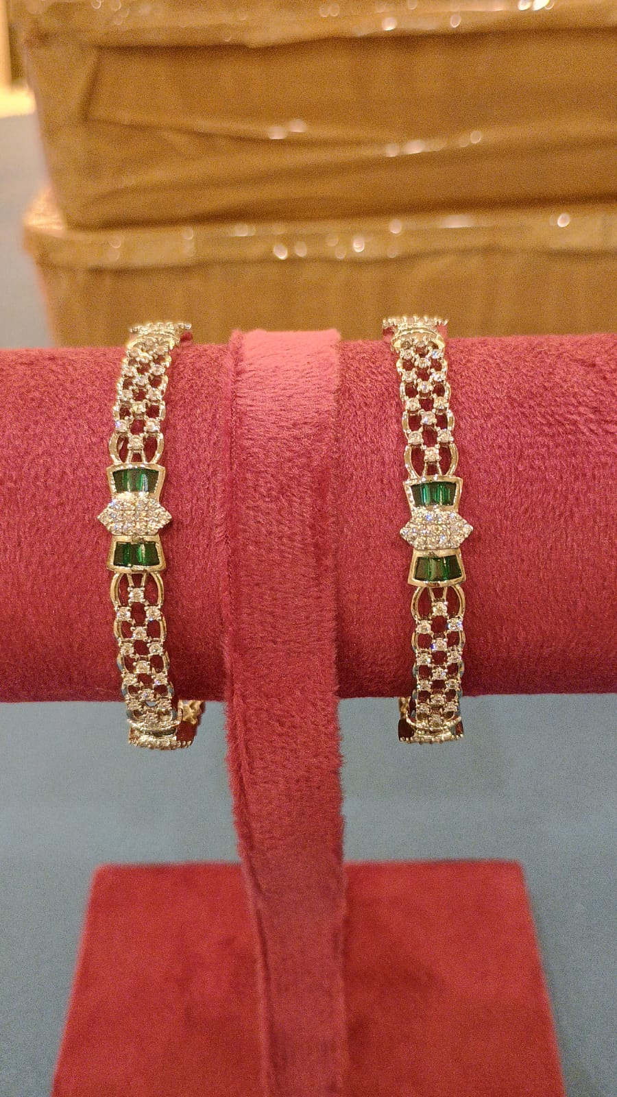 DESCRIPTION - This elegant bangle pair features a stylish dual-panel centre design highlighted with glossy green stones and shimmering white CZ stones. The multi-link pattern adds a rich, premium look while keeping the bangles lightweight and comfortable. Perfect for festive wear, weddings, and everyday elegance, this pair blends modern styling with traditional charm.