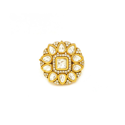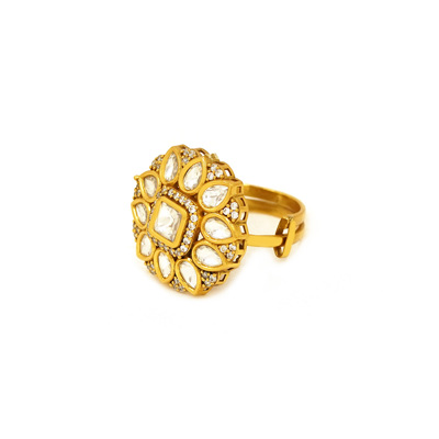 DESCRIPTION - A STATEMENT OF TIMELESS GRANDEUR, THE IMPERIAL RADIANCE POLKI RING SHOWCASES A BEAUTIFULLY ARRANGED CLUSTER OF UNCUT, POLKI-STYLE STONES SET IN WARM GOLD TONE. THE CENTRAL SQUARE MOTIF IS FRAMED BY SOFTLY FACETED ACCENTS, CREATING A LUMINOUS, HERITAGE-INSPIRED DESIGN THAT REFLECTS REGAL ELEGANCE. PERFECT FOR WEDDINGS, FESTIVE OCCASIONS, OR AS A STANDOUT PIECE IN YOUR FINE JEWELRY COLLECTION, THIS RING BLENDS TRADITIONAL ARTISTRY WITH CONTEMPORARY SOPHISTICATION.