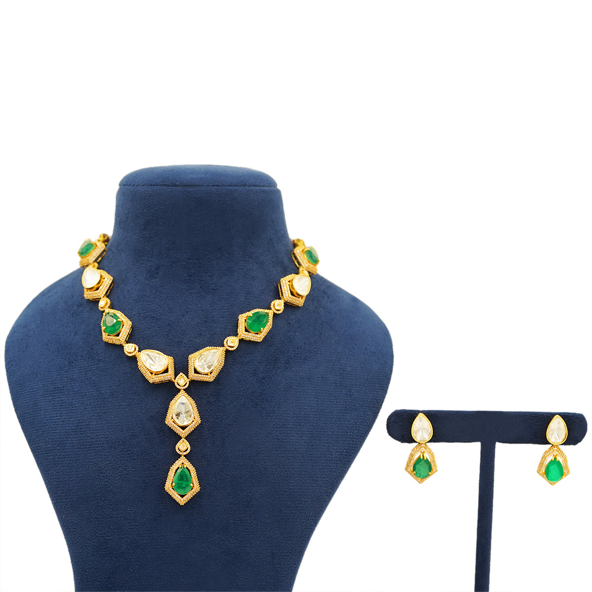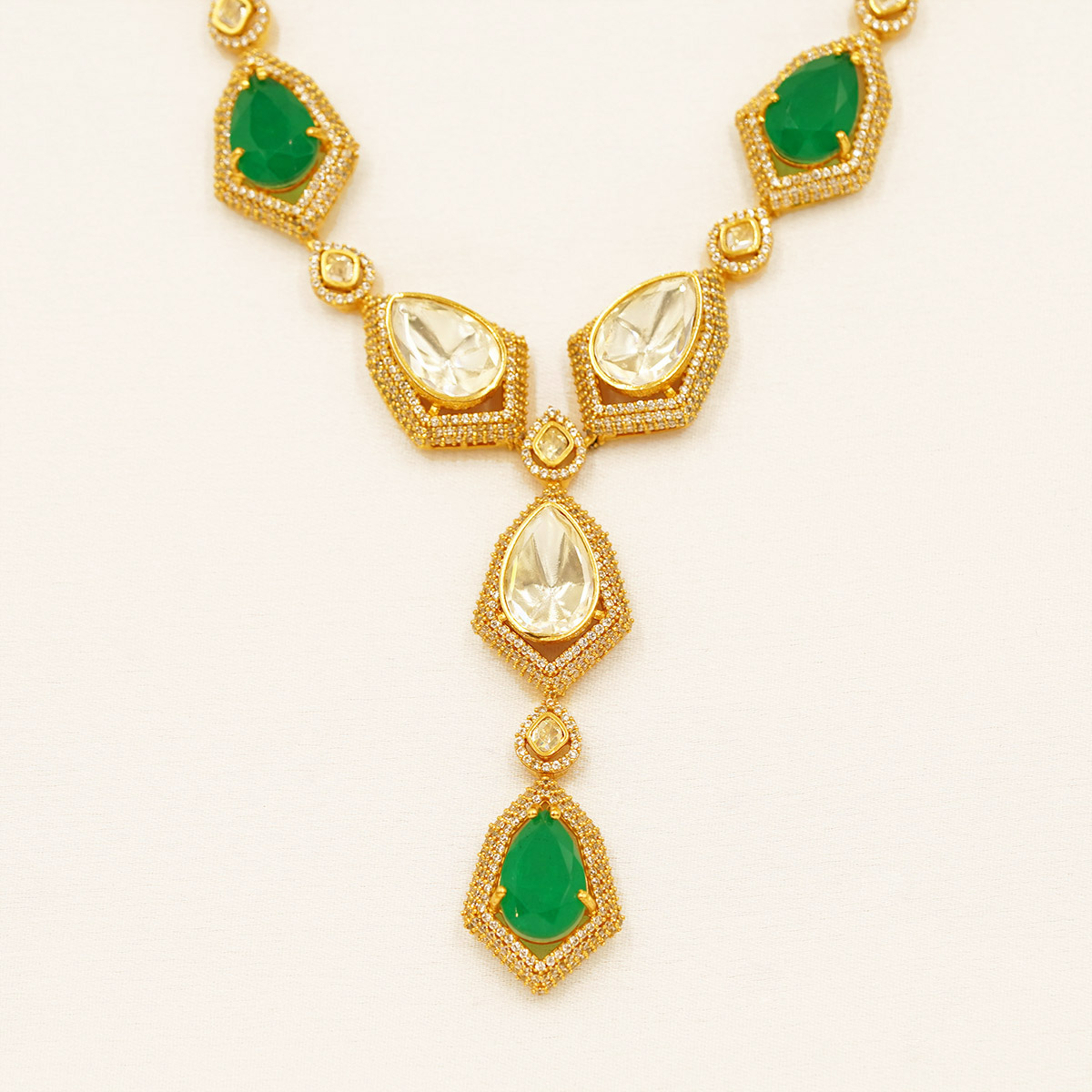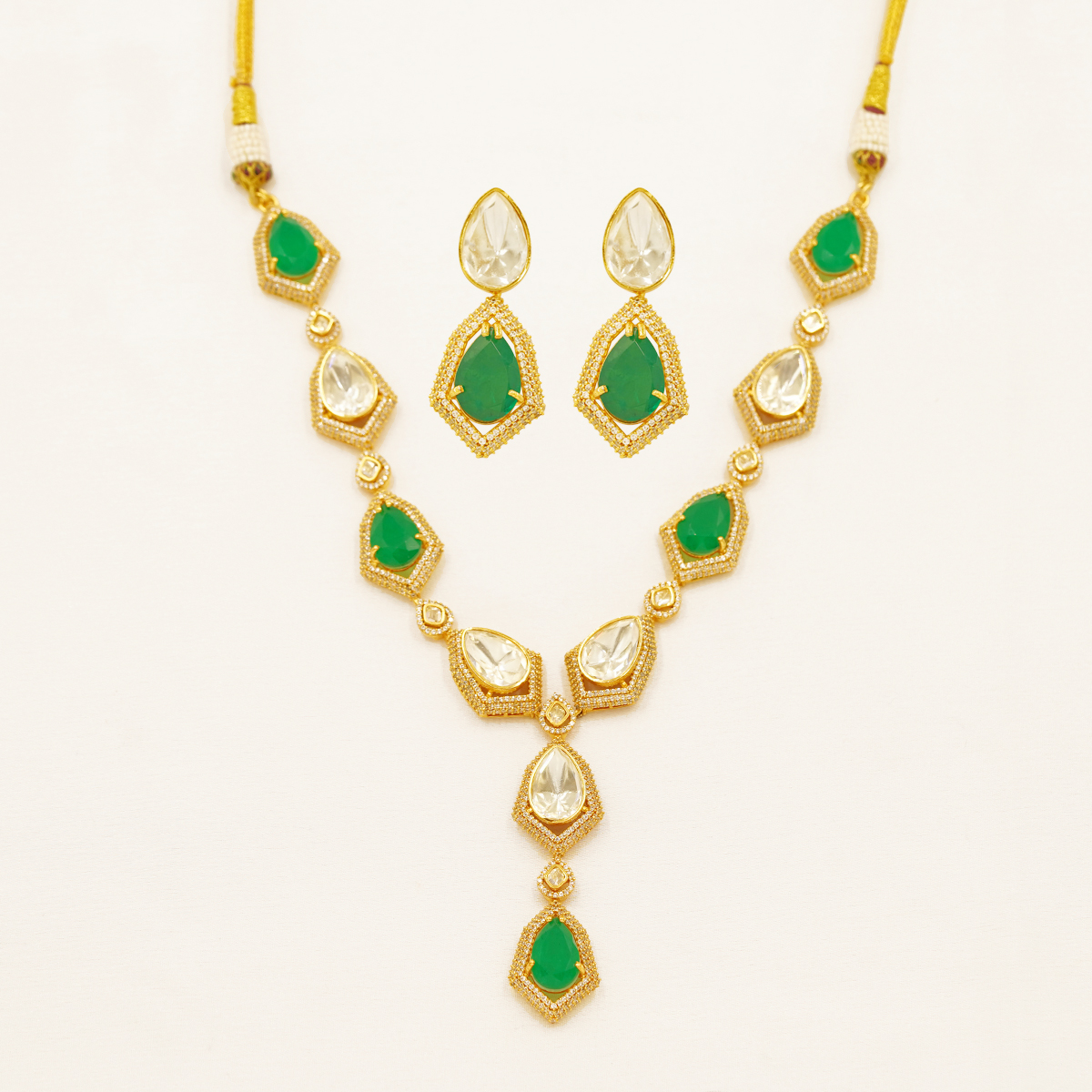 DESCRIPTION - ELEVATE YOUR ELEGANCE WITH THE REGAL EMERALD CASCADE NECKLACE SET, A BREATHTAKING BLEND OF CLASSIC LUXURY AND MODERN REFINEMENT. FEATURING VIVID EMERALD-GREEN STONES FRAMED IN RADIANT GOLD-TONE SETTINGS AND ACCENTED WITH SPARKLING CLEAR CRYSTALS, THIS STATEMENT NECKLACE FLOWS INTO A GRACEFUL DROP THAT ENHANCES THE NECKLINE BEAUTIFULLY. PAIRED WITH MATCHING EARRINGS, THIS SET IS PERFECT FOR WEDDINGS, FESTIVE OCCASIONS, AND EVENING CELEBRATIONS. DESIGNED TO CAPTURE LIGHT FROM EVERY ANGLE, IT ADDS A TOUCH OF ROYALTY AND TIMELESS SOPHISTICATION TO ANY ENSEMBLE.