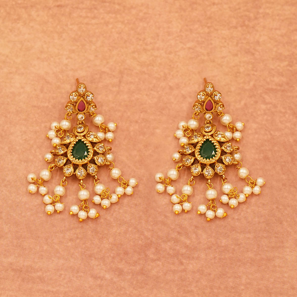 DESCRIPTION - GOLD-TONE METAL BASE WITH INTRICATE KUNDAN (POLKI) STONE SETTINGS.CENTRAL PEAR-SHAPED GREEN STONES (LIKELY EMERALD GLASS OR ONYX) SURROUNDED BY WHITE KUNDAN, WITH SMALL PINK ACCENTS.