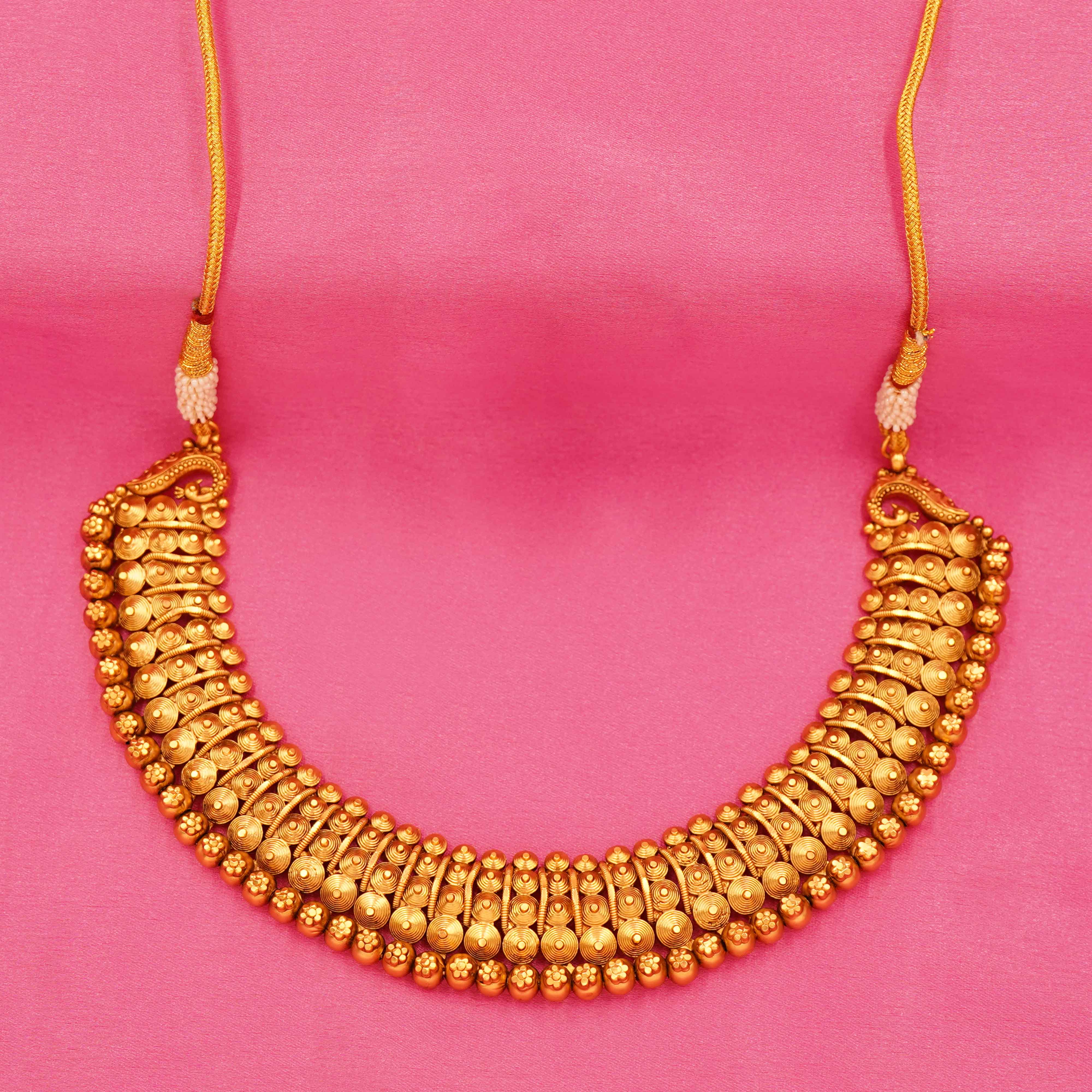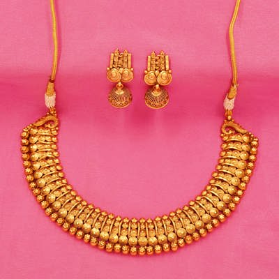 DESCRIPTION - CHOCKER SET/NECKLACE SET, A TRADITIONAL GOLD-TONE METAL JEWELRY SET, WHICH INCLUDES A CHOKER-STYLE NECKLACE AND MATCHING JHUMKA EARRINGS. A TRADITIONAL GOLD-TONE METAL JEWELRY SET, WHICH INCLUDES A CHOKER-STYLE NECKLACE AND MATCHING JHUMKA EARRINGS. THE DESIGN FEATURES INTRICATE PATTERNS AND DETAILING, TYPICAL OF SOUTH INDIAN TEMPLE JEWELRY.