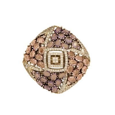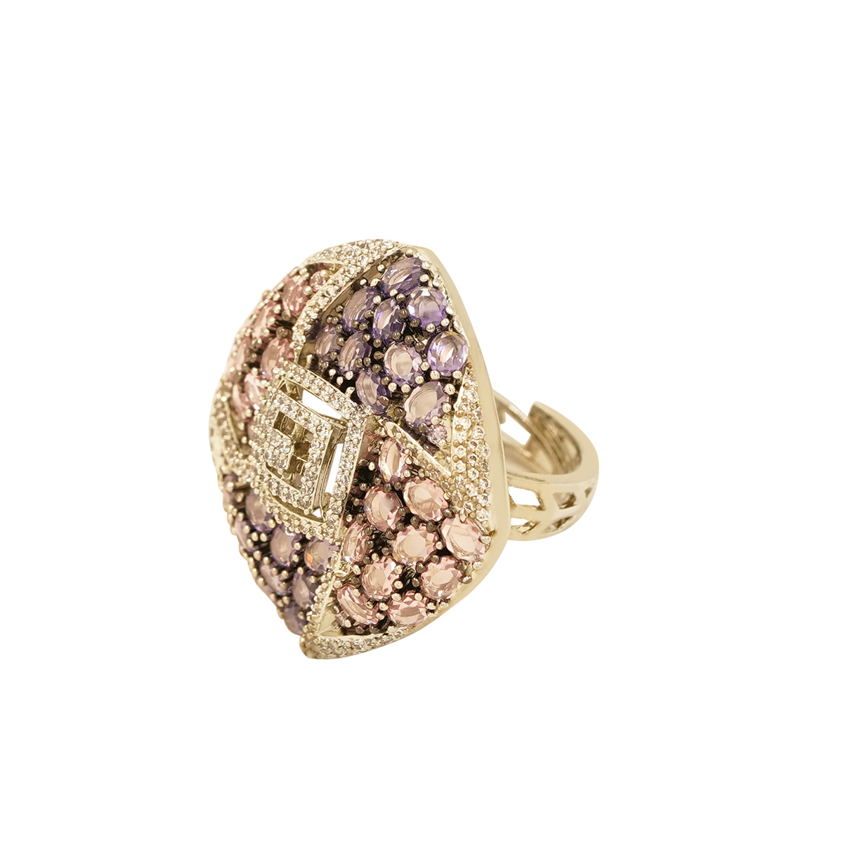DESCRIPTION - THIS LAVENDER CRYSTAL ZIRCONIC HALO RING FEATURES A SOFT MOSAIC OF PASTEL LAVENDER STONES FRAMED BY A RADIANT ZIRCONIC -ACCENTED BORDER. THE GEOMETRIC CENTER IS HIGHLIGHTED WITH A LAYERED HALO DESIGN, CREATING DEPTH, BRILLIANCE, AND A LUXURIOUS VINTAGE-INSPIRED APPEAL. PERFECT FOR EVENING WEAR, SPECIAL OCCASIONS, OR AS A STATEMENT PIECE, THIS RING ADDS A TOUCH OF REFINED GLAMOUR TO ANY ENSEMBLE.