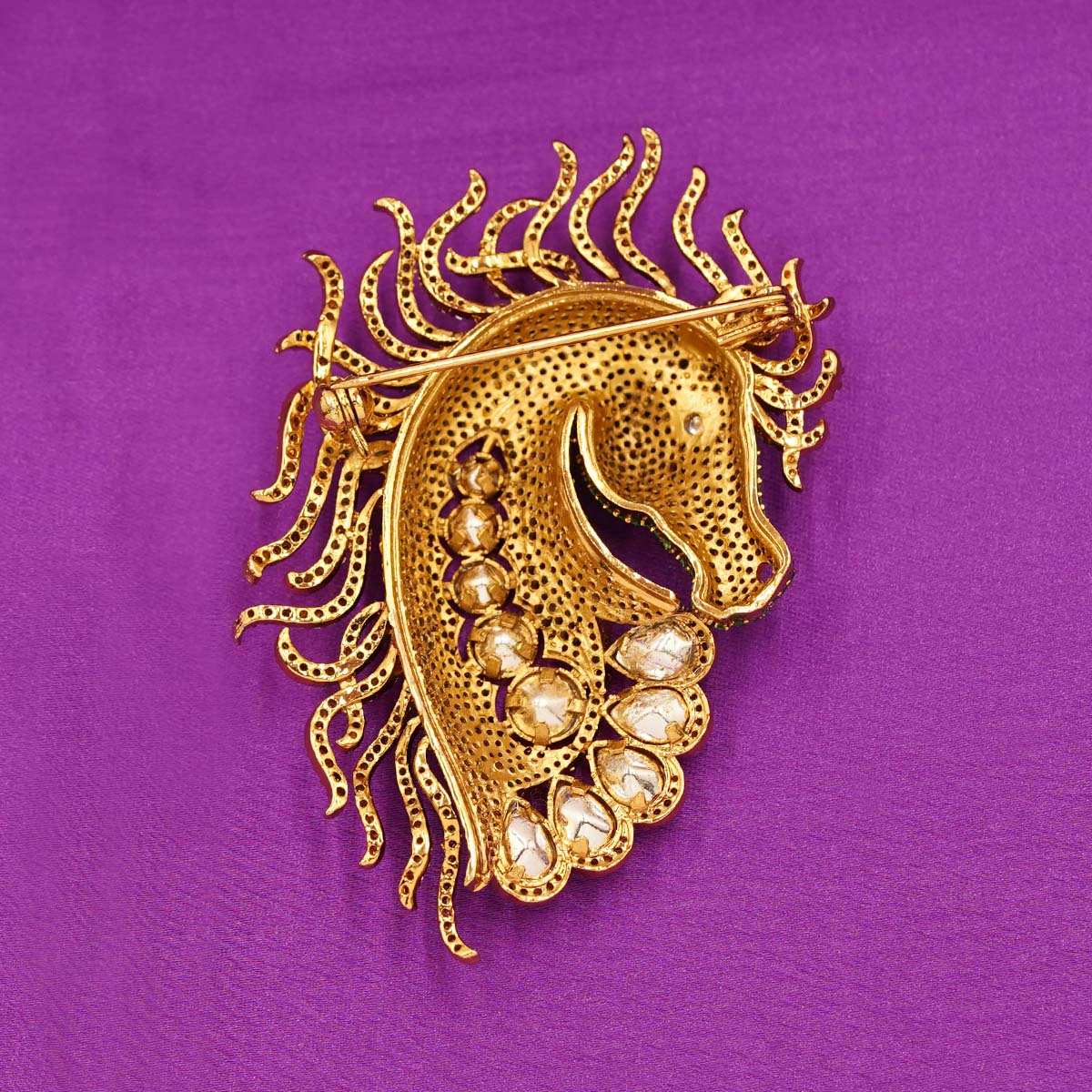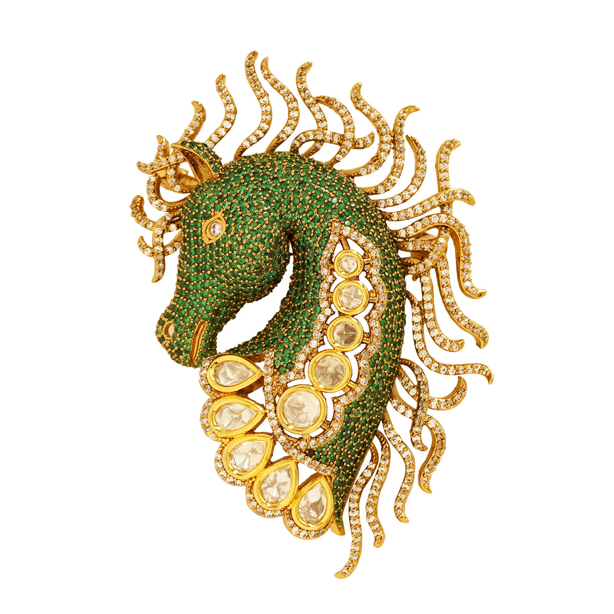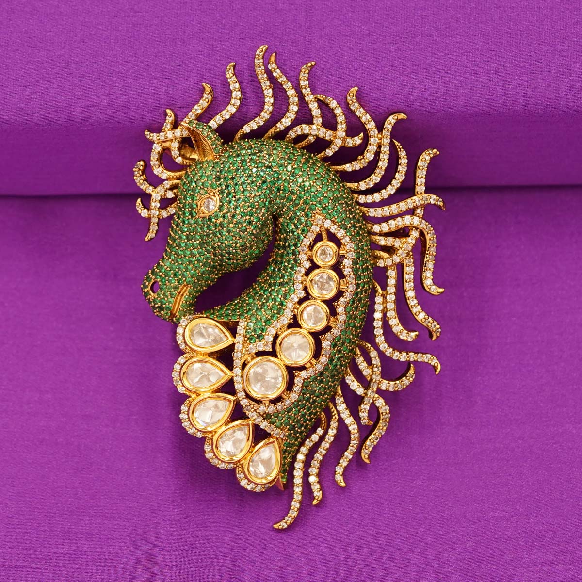 Majestic Green Stallion Brooch with Kundan Mane & Crystal Detailing