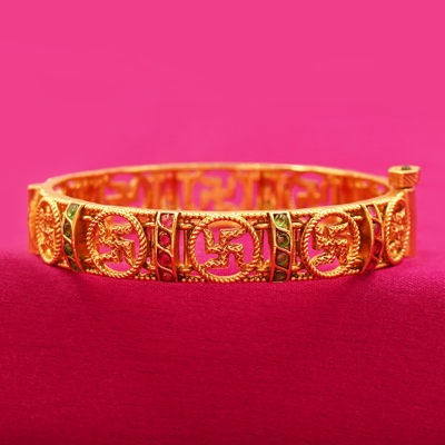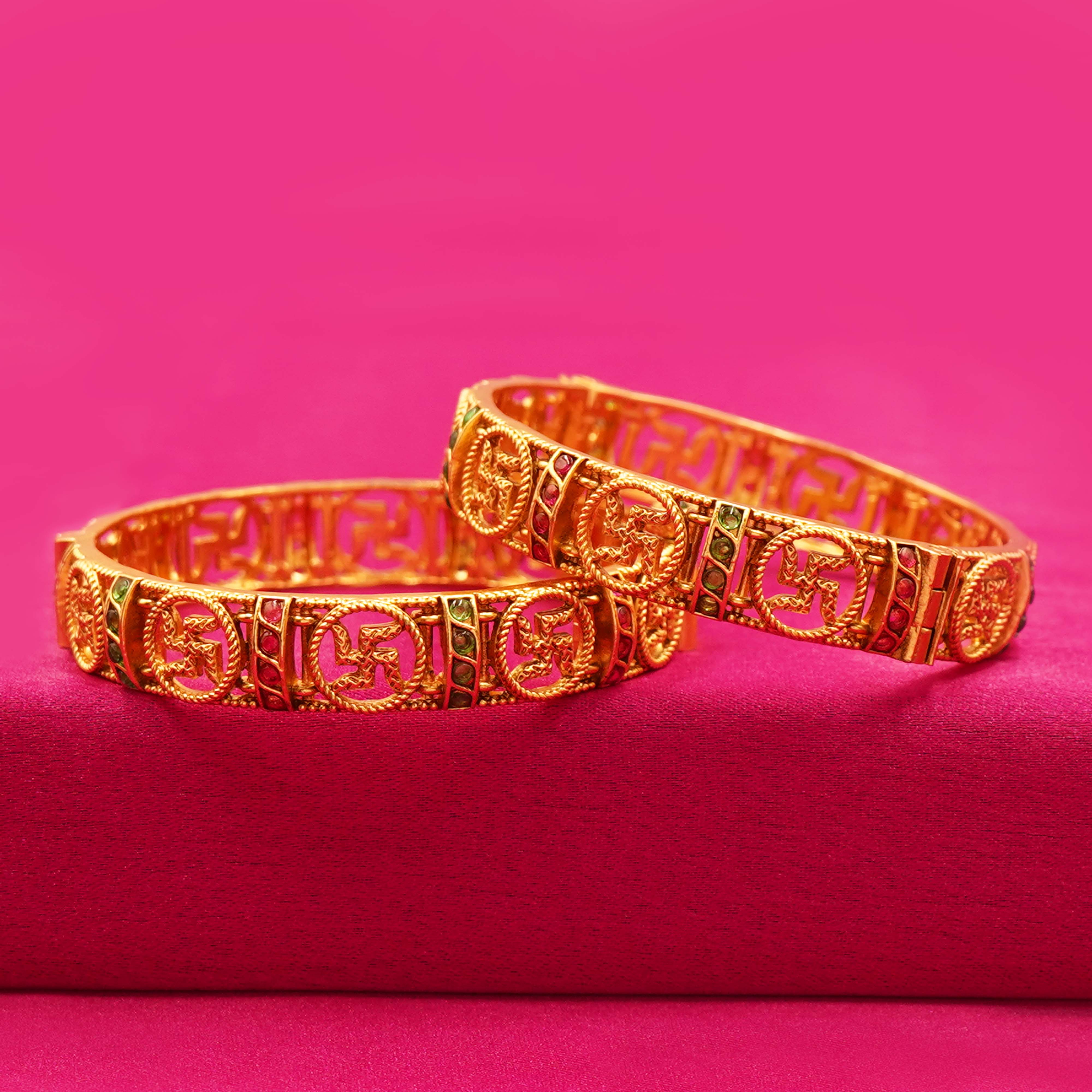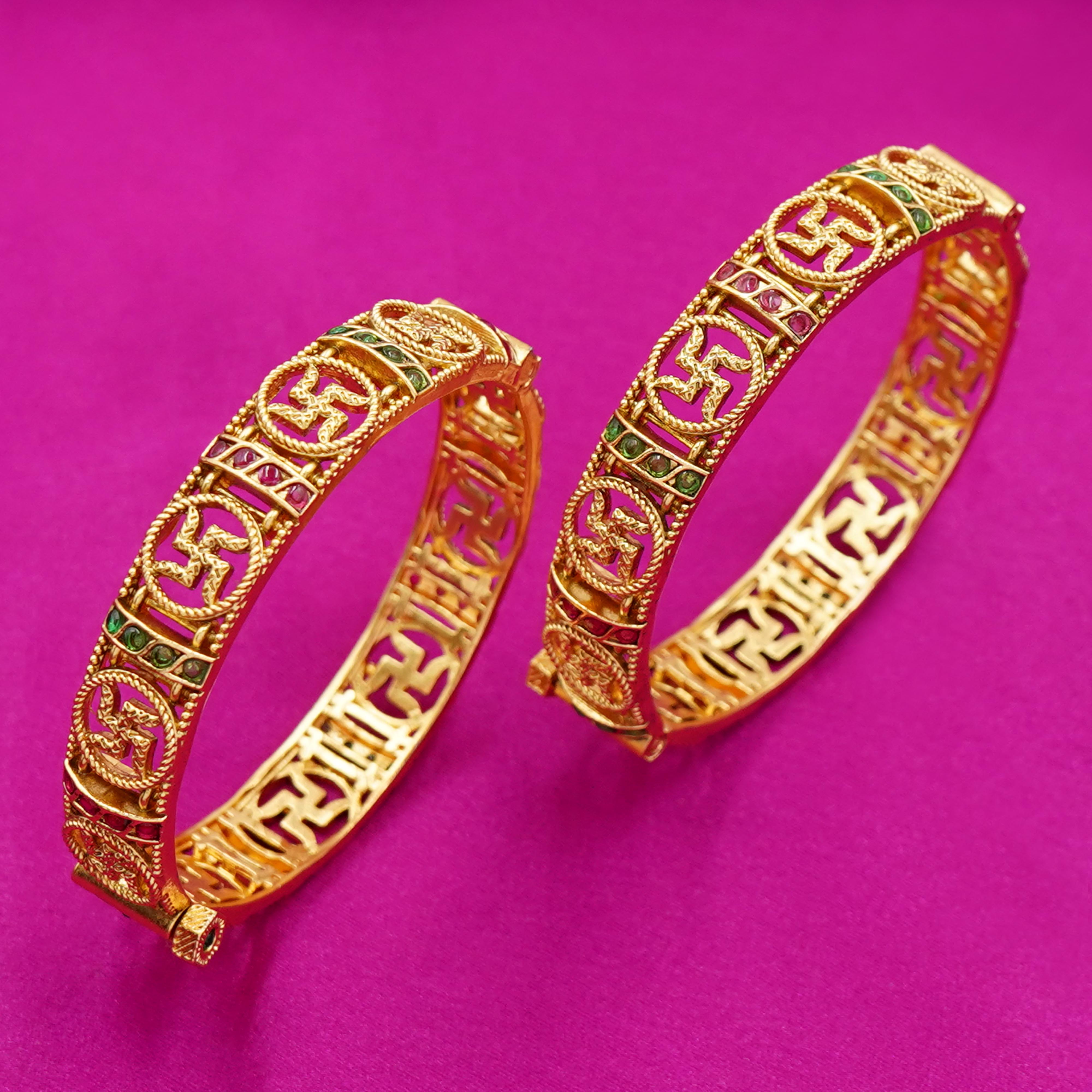 DESCRIPTION - Two bangles shimmer with sacred geometry—symbols that feel like mantras cast in gold tone. Their rhythmic patterns evoke ritual and mystique. Between them, the central kangan holds silence, like the breath between chants. This set is for the seeker, the bride, the mystic—who wears her adornment as invocation.