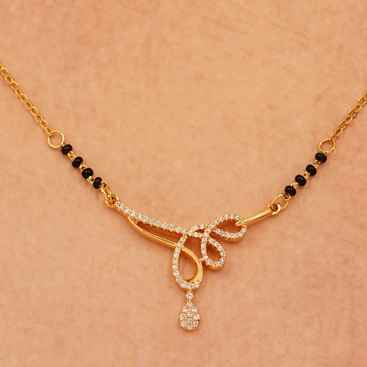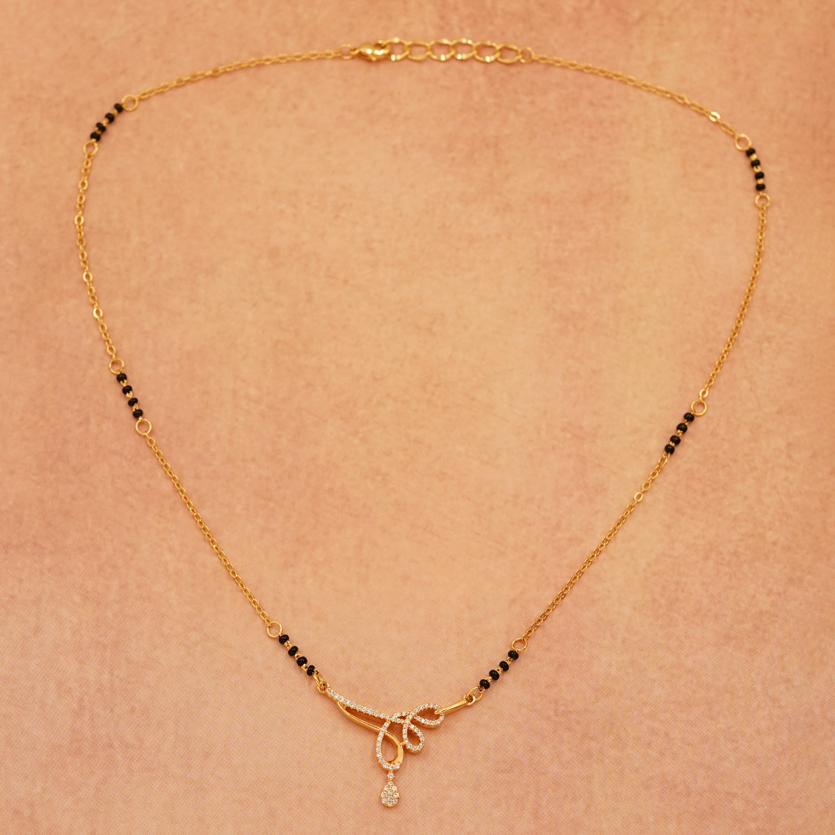 DESCRIPTION - This elegant mangalsutra features a sleek and modern knot-style pendant with a delicate drop accent, complemented by a fine chain with black bead detailing. Perfect for women who love subtle sophistication.