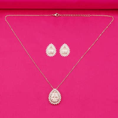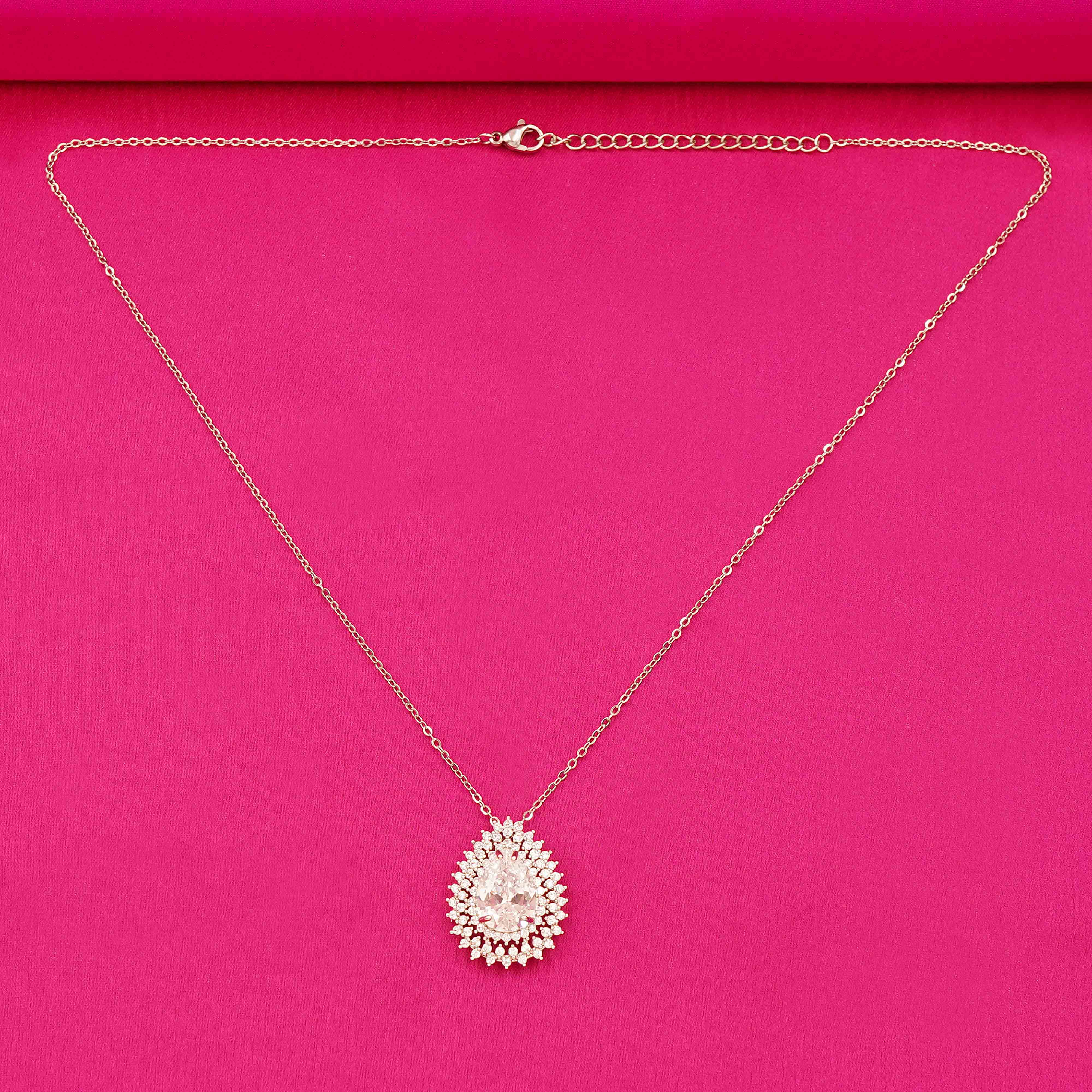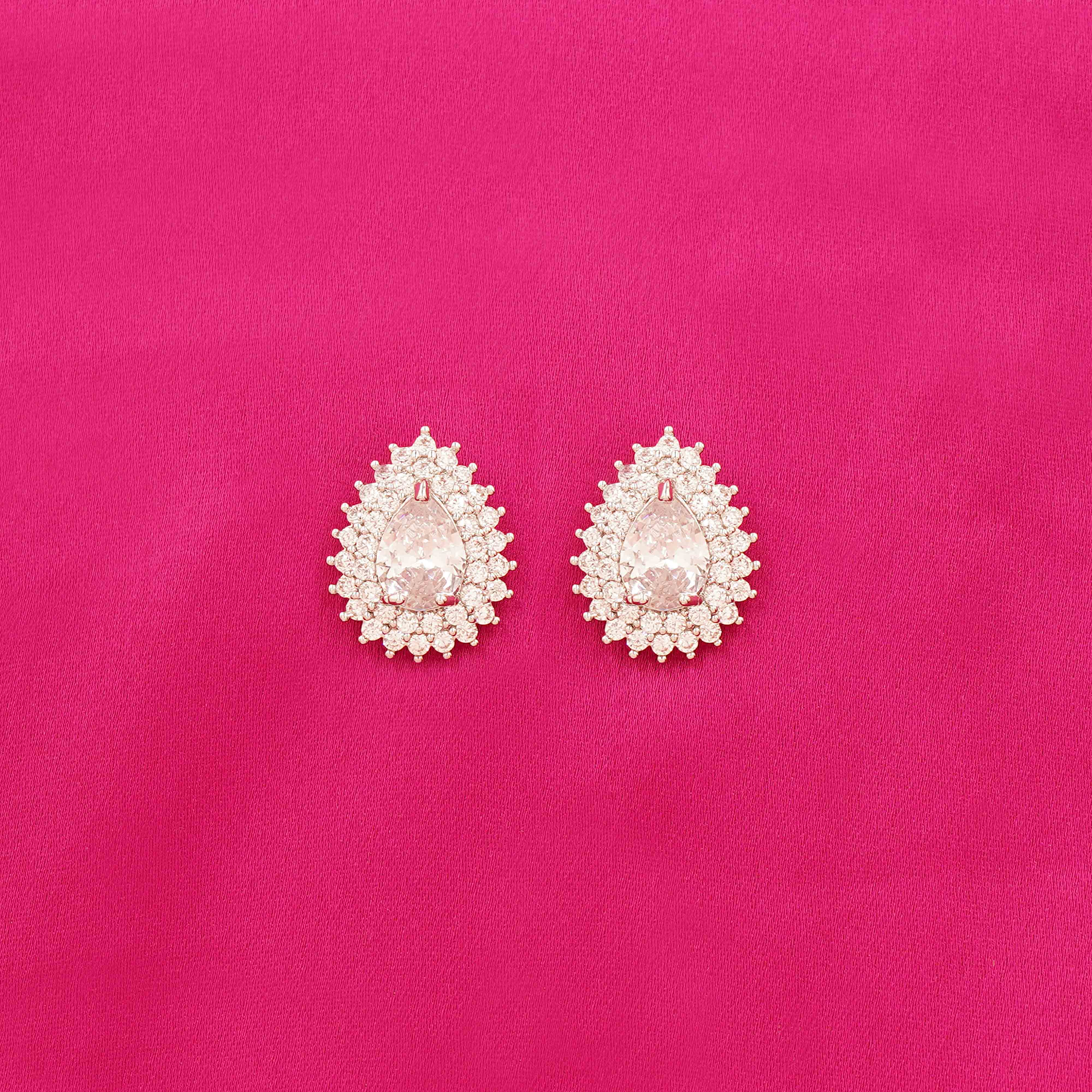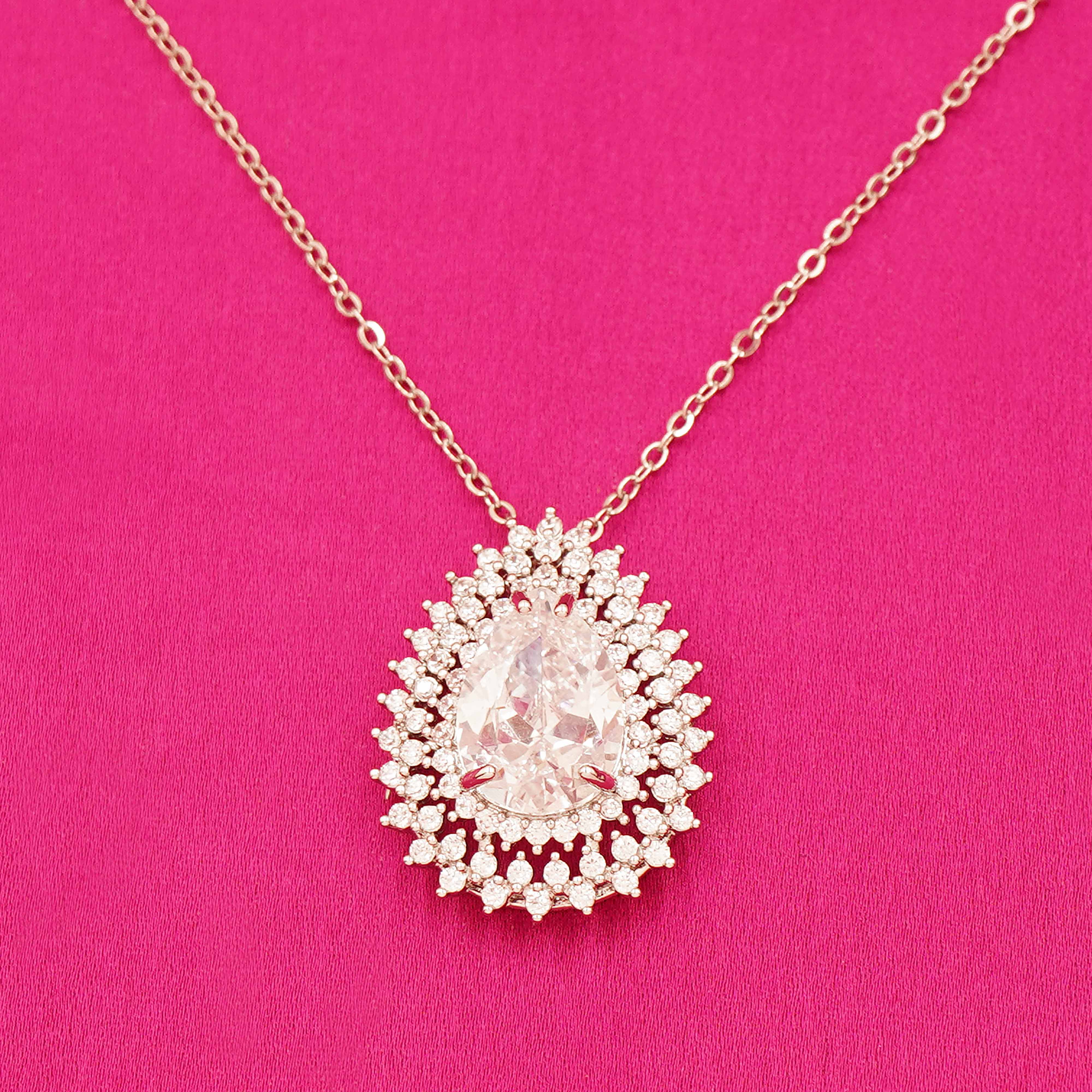 DESCRIPTION - This exquisite teardrop-shaped necklace and earring set. Featuring a brilliant light CZ stone at the center, each piece is encircled by multiple layers of sparkling CZ stones that enhance its radiant allure.