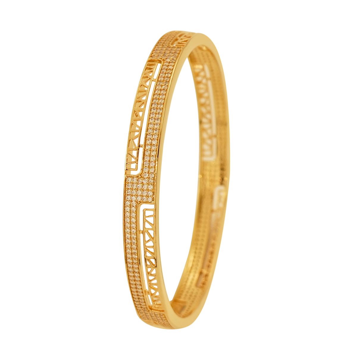 DESCRIPTION - This stylish bangle pair features a sleek, modern design with intricate cutwork patterns and finely studded stones that add a rich sparkle. Finished in a high-quality gold-tone (not real gold), these bangles are lightweight, durable, and perfect for elevating both festive and everyday looks.