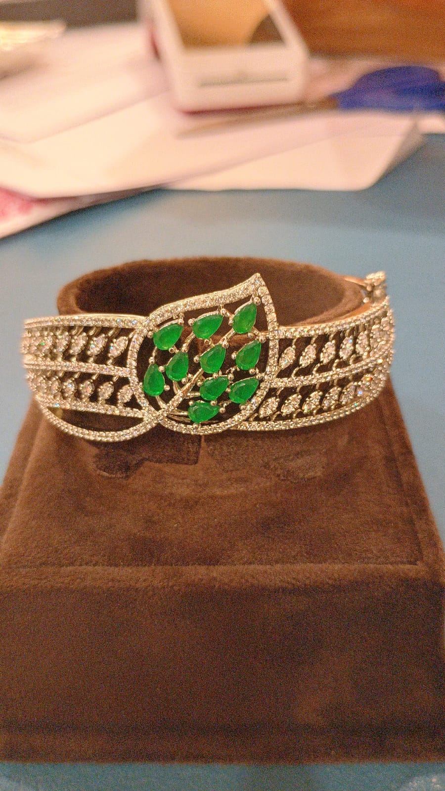 DESCRIPTION - This elegant designer kada features a beautifully crafted leaf motif highlighted with vibrant green teardrop stones. Made with a premium metal finish, this kada combines modern elegance with traditional charm, making it perfect for weddings, festive wear, parties, and special occasions. Lightweight yet statement-worthy, it elevates any ethnic or Indo-western outfit effortlessly.