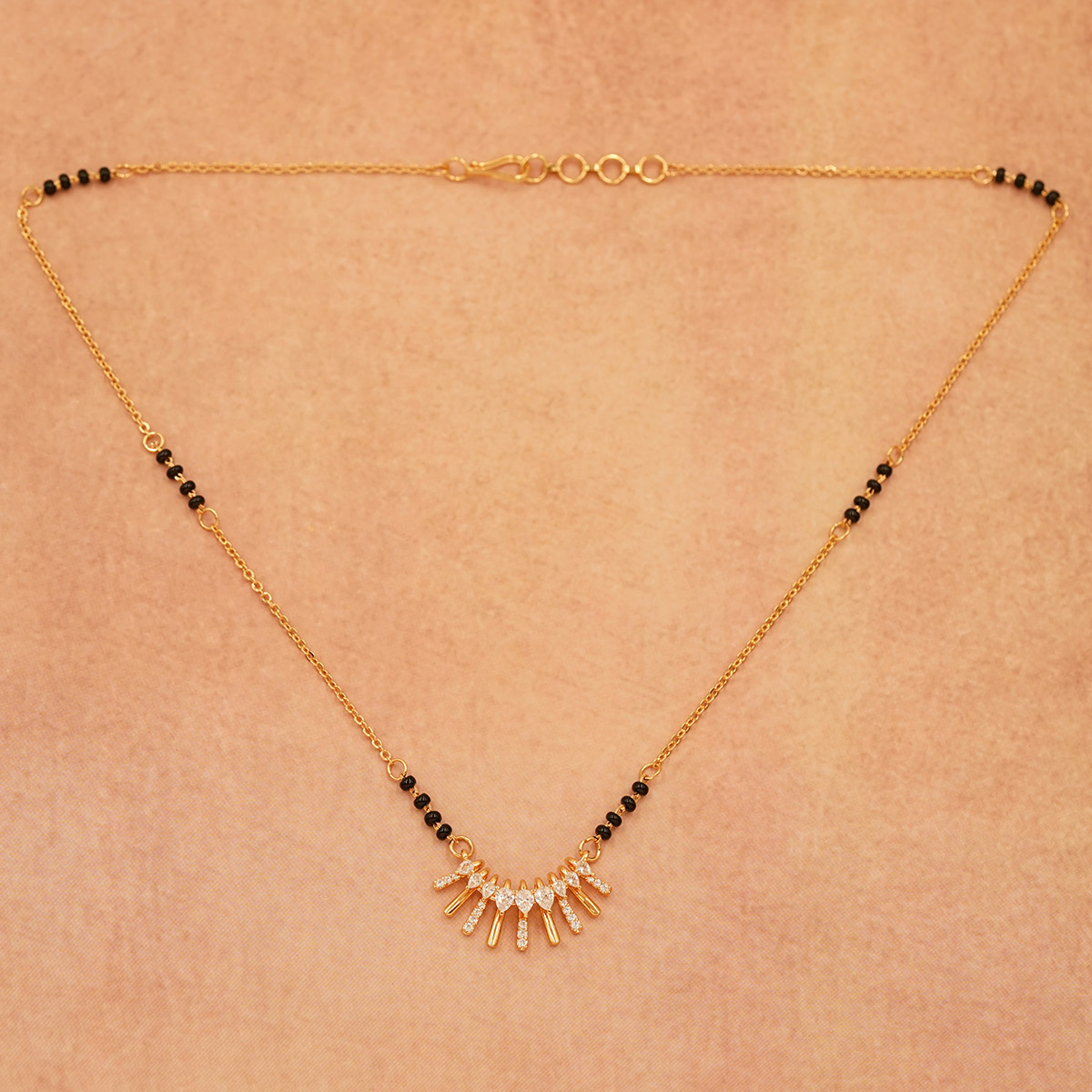 DESCRIPTION - A stylish mangalsutra featuring a unique sunburst-inspired pendant that adds a radiant charm to your everyday look. The sleek black-bead chain beautifully complements its modern yet traditional design.