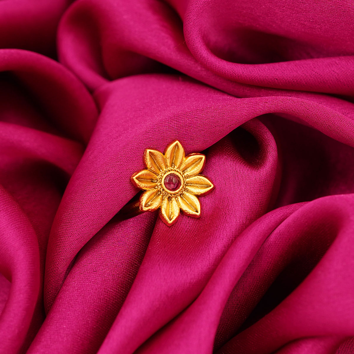DESCRIPTION - INSPIRED BY THE ELEGANCE OF BLOOMING PETALS, THE RADIANT RUBY BLOSSOM GOLD TONE RING FEATURES A BEAUTIFULLY SCULPTED FLORAL DESIGN IN RICH GOLDEN TONES. AT ITS HEART LIES A STRIKING RUBY-RED STONE THAT ADDS A TOUCH OF WARMTH AND REGAL CHARM. THE INTRICATE PETAL DETAILING GIVES THIS RING A LUXURIOUS YET GRACEFUL APPEAL, MAKING IT PERFECT FOR FESTIVE OCCASIONS, TRADITIONAL WEAR, OR AS A STATEMENT PIECE FOR SPECIAL MOMENTS. A TIMELESS DESIGN THAT BLENDS CLASSIC ARTISTRY WITH MODERN ELEGANCE.