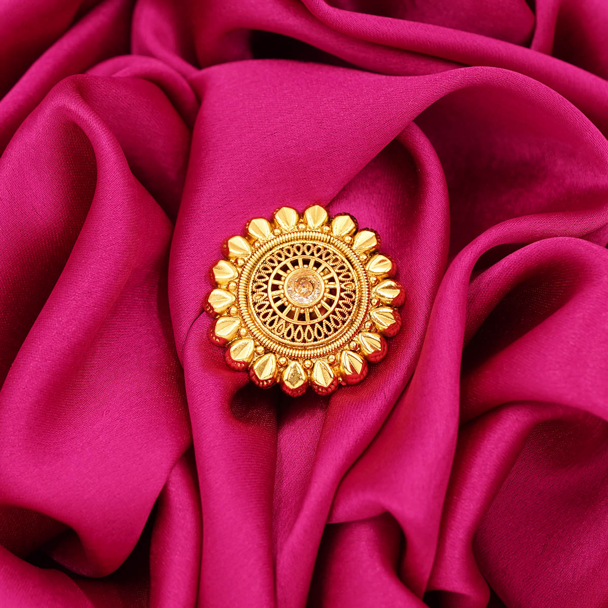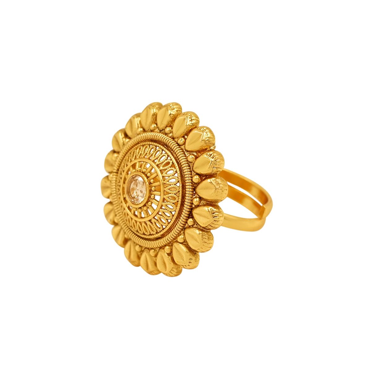 DESCRIPTION - THIS EXQUISITE GOLD TONE RING FEATURES A STRIKING SUNBURST-INSPIRED DESIGN WITH INTRICATE DETAILING AND A POLISHED FINISH THAT REFLECTS TIMELESS ELEGANCE. THE CIRCULAR MOTIF, HIGHLIGHTED BY DELICATE PATTERNS AND A LUMINOUS CENTRAL ACCENT, ADDS A TOUCH OF REGAL CHARM TO ANY ENSEMBLE. PERFECT FOR FESTIVE OCCASIONS, WEDDINGS, OR EVERYDAY SOPHISTICATION, THIS RING PAIRS BEAUTIFULLY WITH BOTH TRADITIONAL AND CONTEMPORARY OUTFITS, MAKING IT A VERSATILE ADDITION TO YOUR JEWELRY COLLECTION.