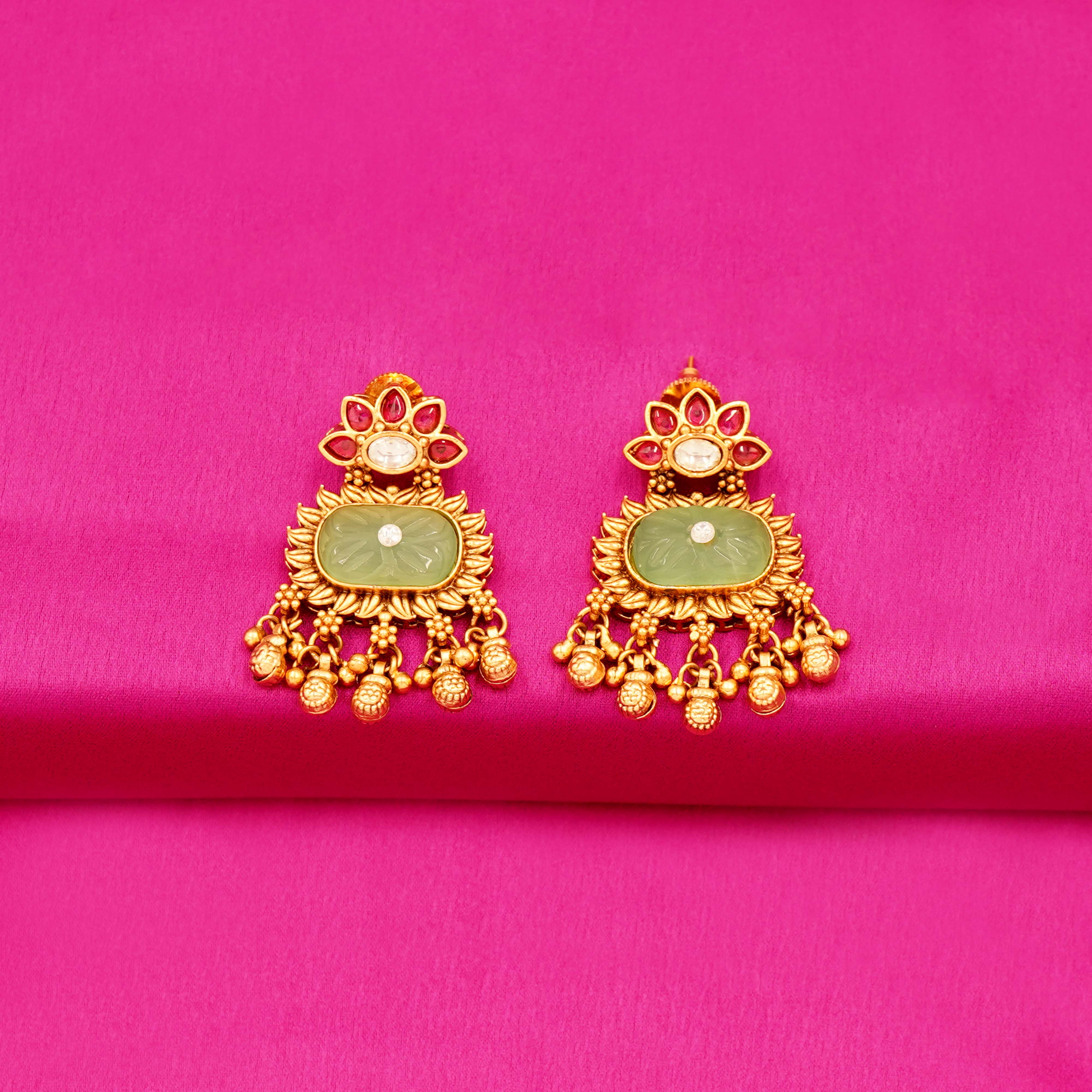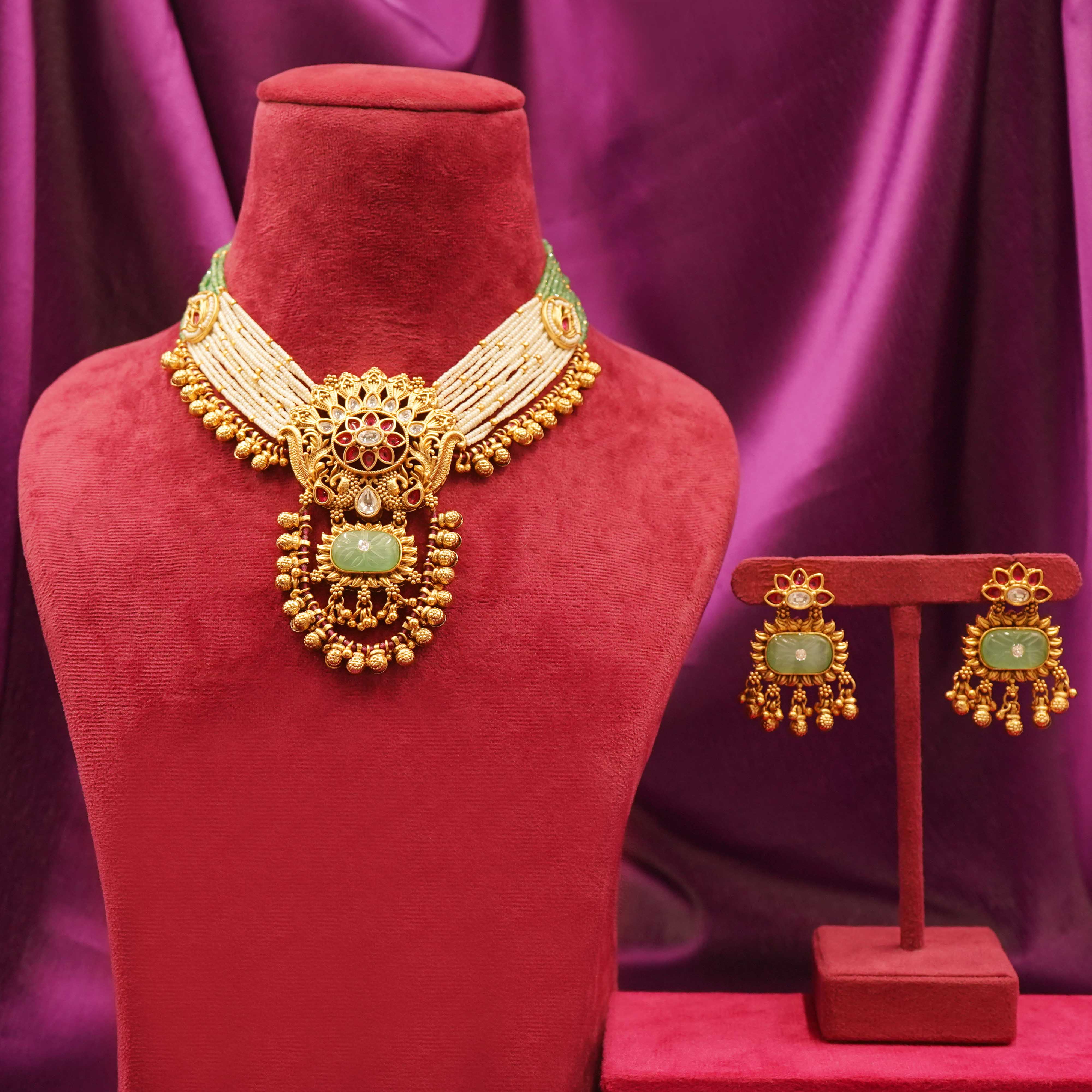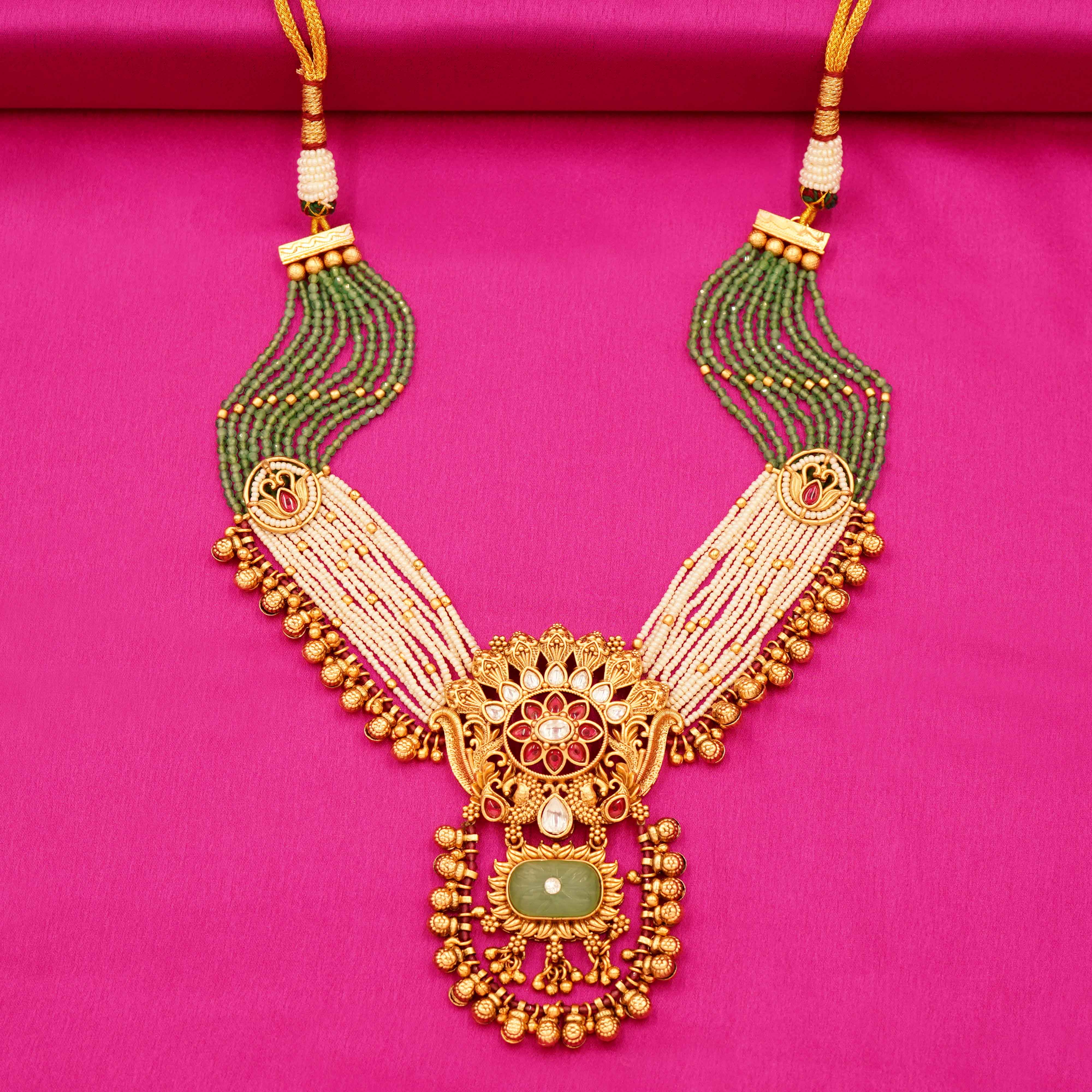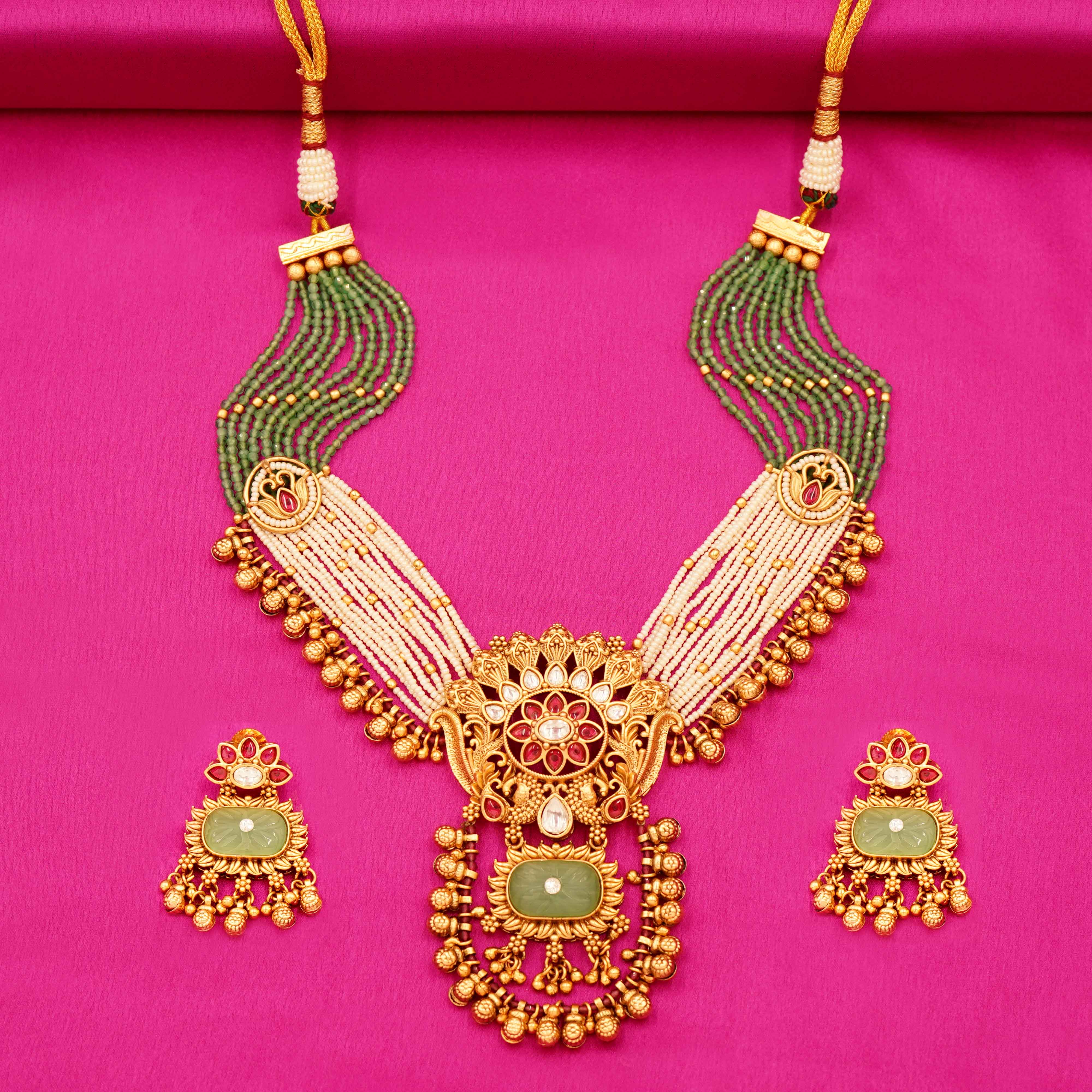 Rajasthani Heritage Moti Haar with Green Stone Necklace & Earrings Set