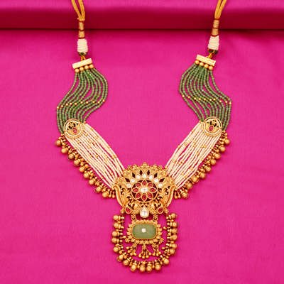DESCRIPTION - Bring the grandeur of Rajasthan into your jewellery collection with this Jaipuri Rajwada Moti Haar. Designed with multi-strand pearl beads, a bold central pendant embellished with kundan and green stone detailing, and paired with matching earrings, this set radiates regal charm. Perfect for weddings, bridal looks, and festive occasions, it captures the timeless elegance of traditional Rajasthani artistry.