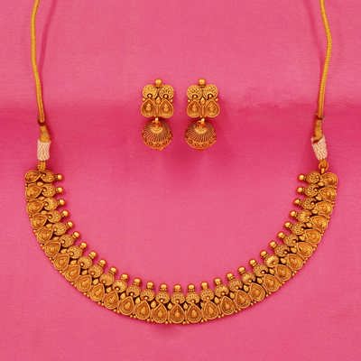 DESCRIPTION - NECKLACE SET, A TRADITIONAL INDIAN JEWELRY SET CONSISTING OF A NECKLACE AND A PAIR OF JHUMKA EARRINGS. THE NECKLACE SET IS CRAFTED IN A TEMPLE-STYLE DESIGN, CHARACTERIZED BY INTRICATE PATTERNS RESEMBLING PEACOCKS AND FLORAL MOTIFS, COMMONLY SEEN IN SOUTH INDIAN JEWELRY.