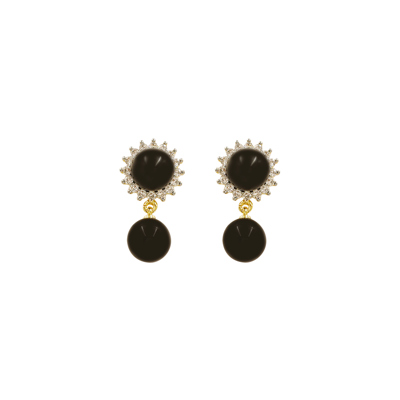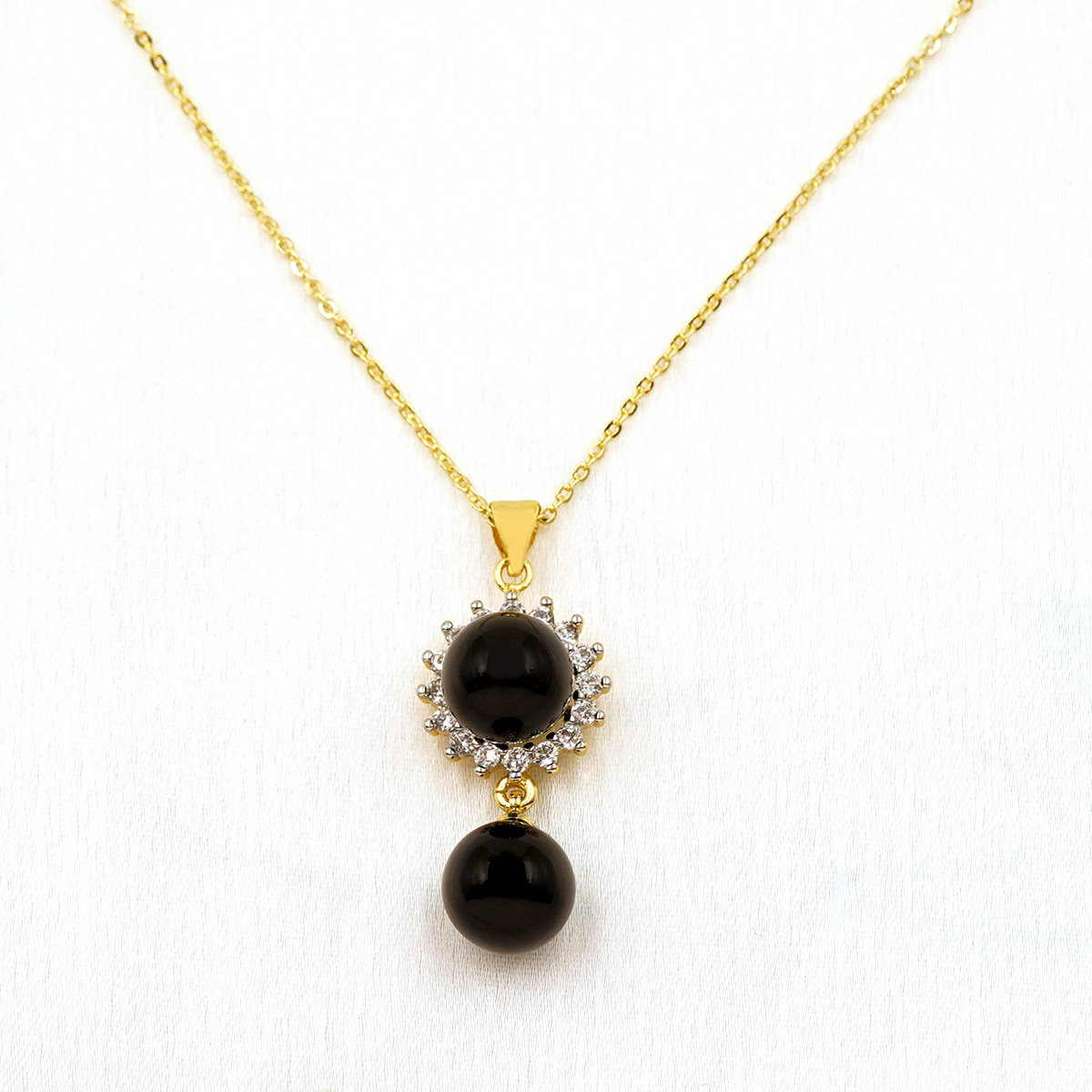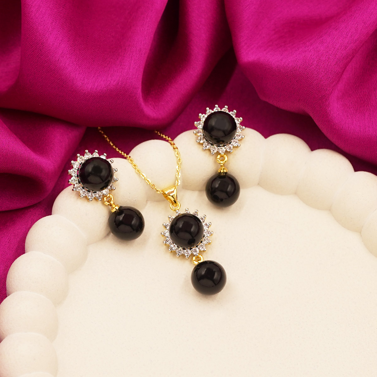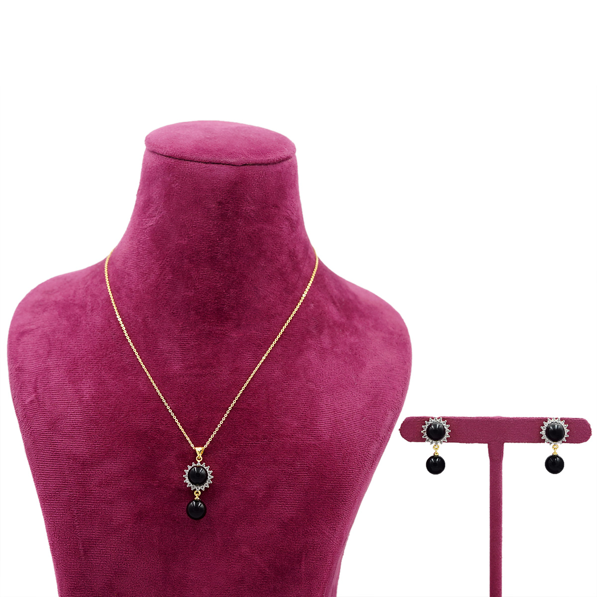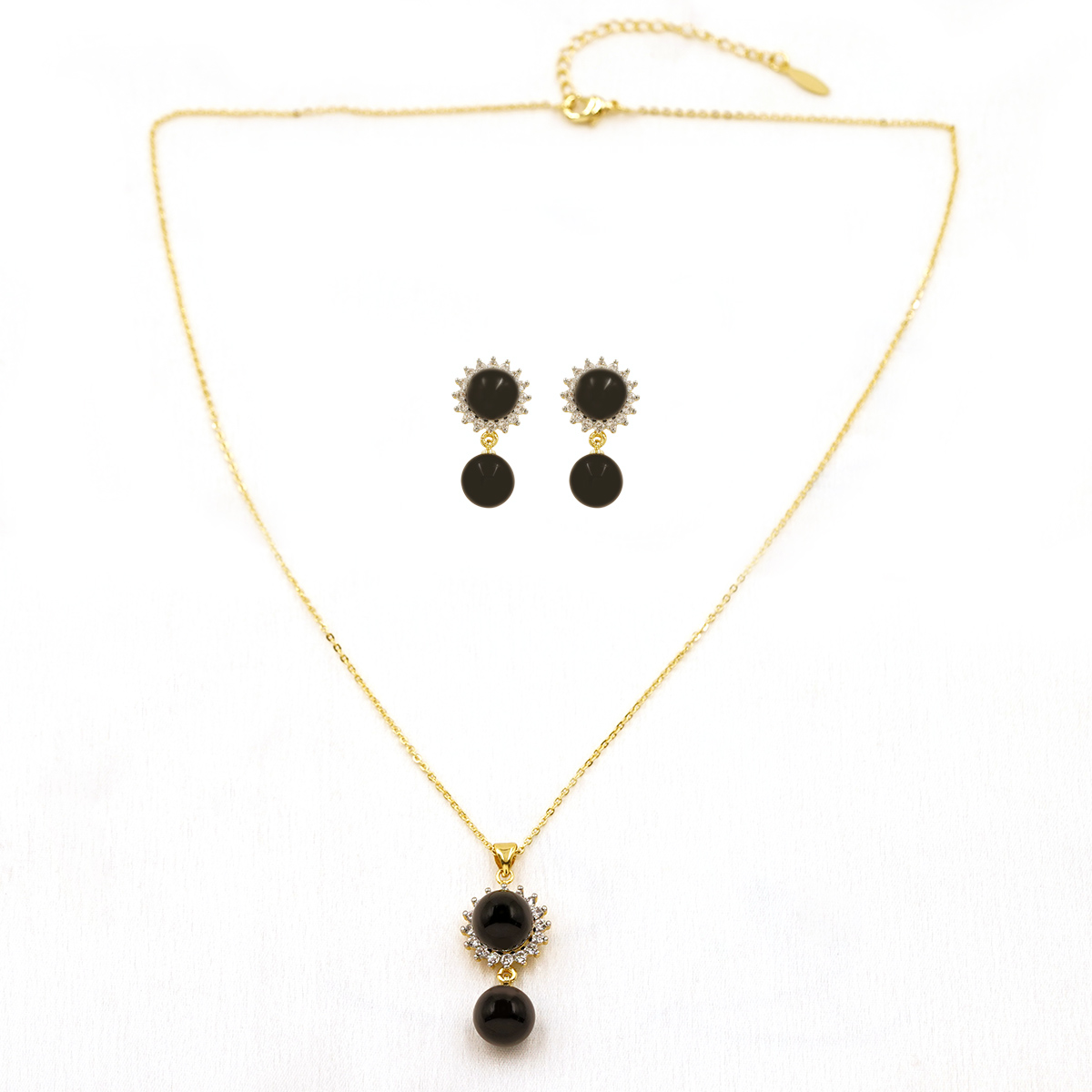 DESCRIPTION - THIS ELEGANT NECKLACE SET FEATURES A GRACEFUL GOLD-TONED CHAIN ADORNED WITH A SPARKLING CIRCULAR HALO PENDANT AND A STRIKING BLACK DROP BEAD FOR A TOUCH OF CLASSIC SOPHISTICATION. PAIRED WITH MATCHING HALO STUD EARRINGS AND BLACK BEAD DROPS, THIS SET BLENDS TRADITIONAL CHARM WITH MODERN ELEGANCE. PERFECT FOR FESTIVE OCCASIONS, EVENING WEAR, OR REFINED EVERYDAY STYLING, IT ADDS A SUBTLE YET REGAL ACCENT TO ANY OUTFIT.