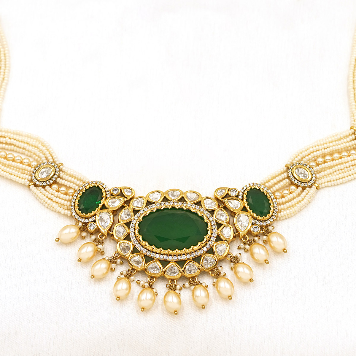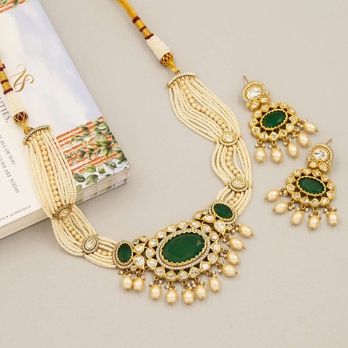 Regal Green Kundan Choker Necklace Set with Pearl Drops