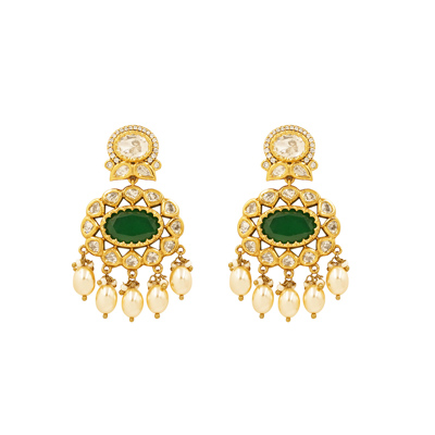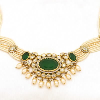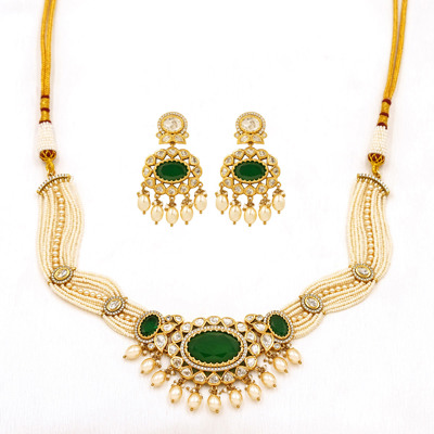 DESCRIPTION - Elevate your ethnic look with this exquisite regal green kundan choker necklace set, beautifully crafted to reflect timeless elegance. The centerpiece features a rich green stone surrounded by intricate kundan work, enhanced with delicate pearl drop embellishments that add graceful movement and charm. Paired with matching statement earrings, this set is perfect for weddings, festive occasions, and traditional celebrations. Designed to complement both classic and contemporary outfits, it brings a royal touch to your jewelry collection.