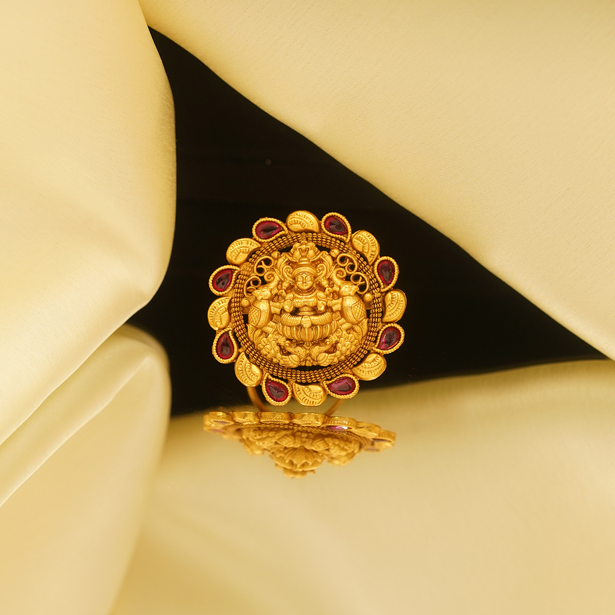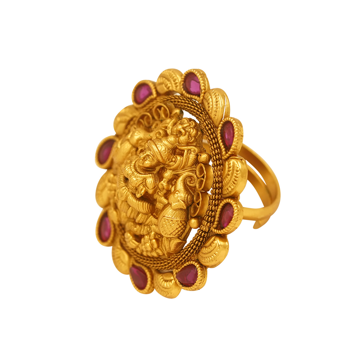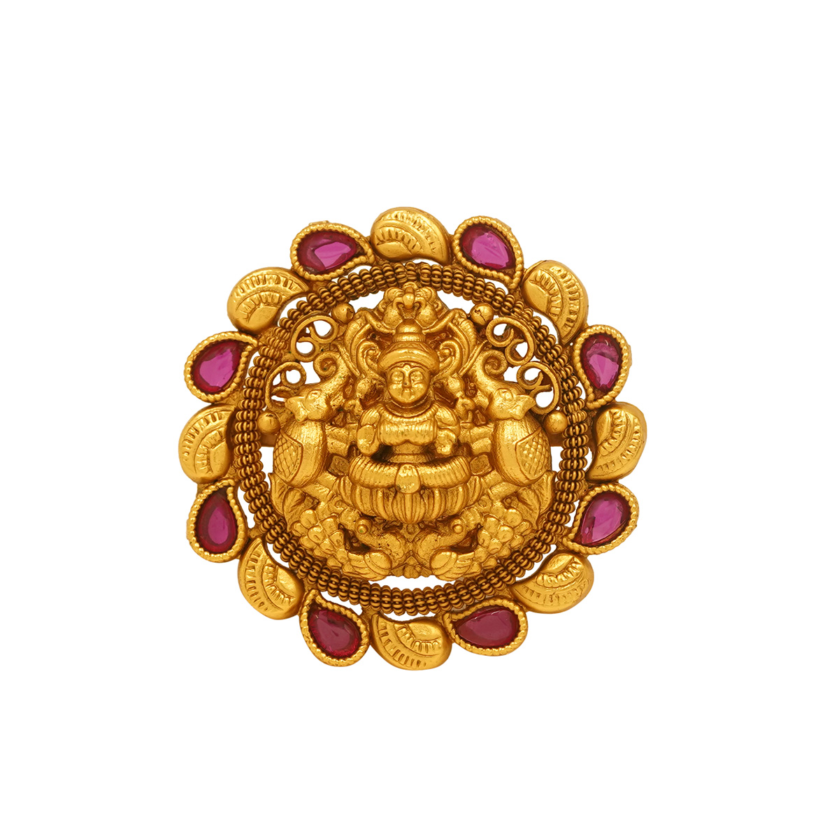 DESCRIPTION - An opulent gold tone ring featuring an intricately carved Goddess Lakshmi motif at the center, symbolizing prosperity, abundance, and divine grace. Framed with delicate ruby-toned accents and ornate filigree detailing, this statement piece blends traditional temple artistry with royal elegance. Perfect for bridal wear, festive occasions, or collectors of heritage-inspired jewelry.