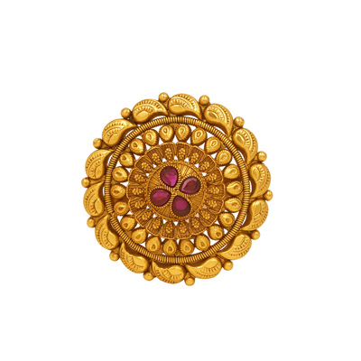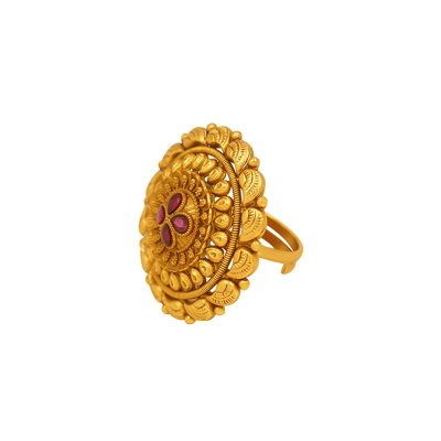 DESCRIPTION - A majestic floral-inspired gold tone ring adorned with radiant ruby-toned polki stones and intricate handcrafted detailing. The layered circular design creates a bold statement, reflecting timeless royal elegance. Perfect for bridal wear, festive occasions, or as a signature heirloom piece that blends traditional artistry with luxurious charm.