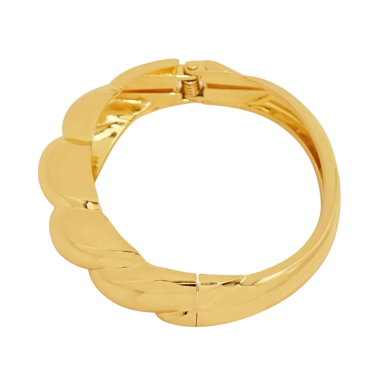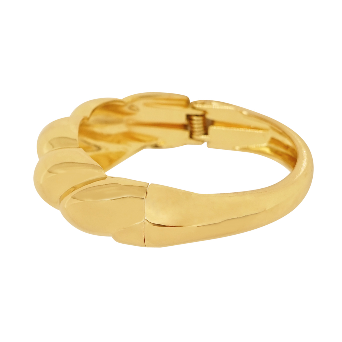 DESCRIPTION - A striking, gold-tone bangle with a distinctive ribbed design. The piece features a highly polished finish and a series of raised, dome-like segments that create a textured, wavy effect along the top. This bold accessory is equipped with a hinged clasp for a secure and comfortable fit.