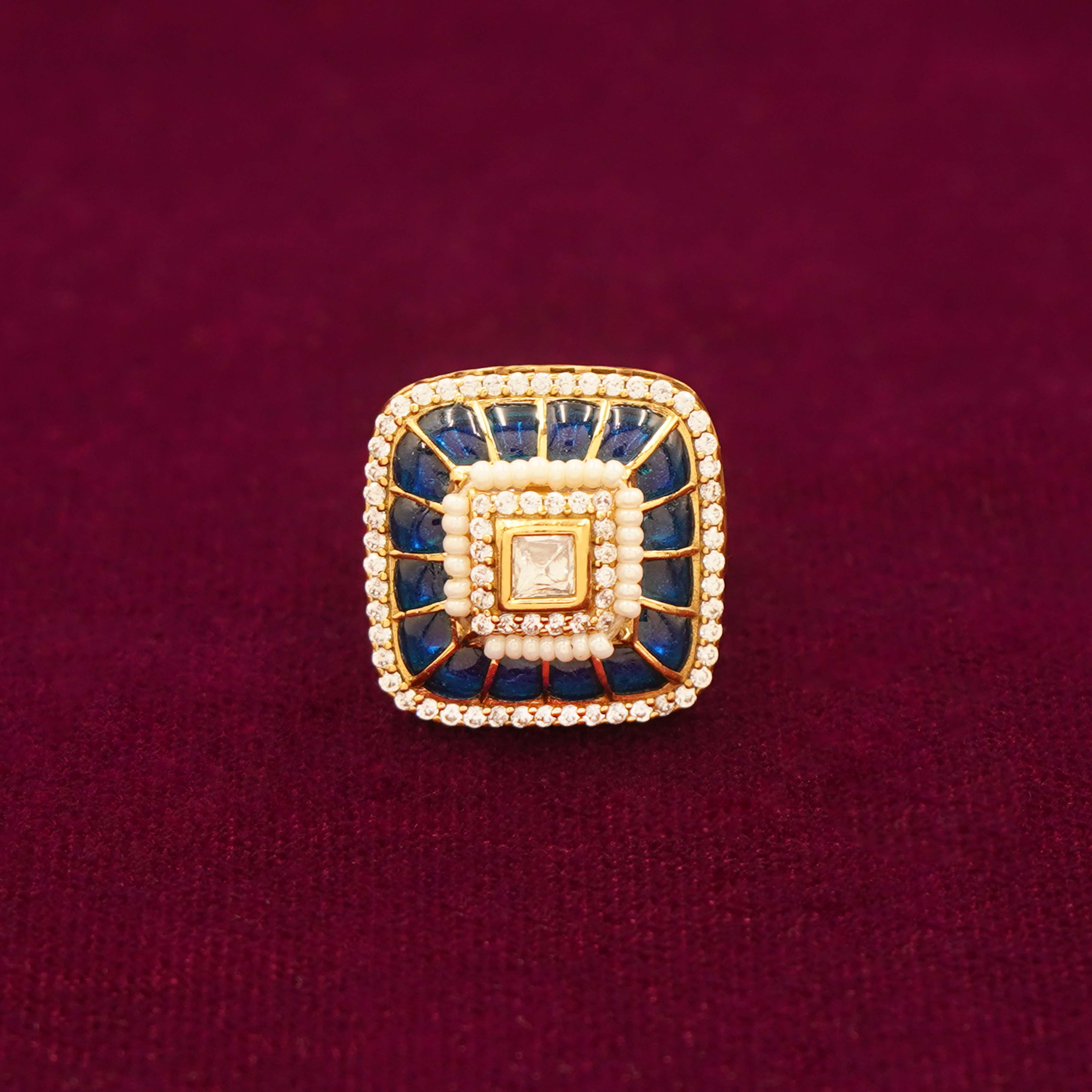 DESCRIPTION - MAKE A BOLD STATEMENT WITH THIS REGAL GOLD TONE RING, FEATURING A STRIKING DEEP BLUE RECTANGULAR STONE AT THE CENTER, FRAMED BY A DELICATE HALO OF SPARKLING ACCENTS. CRAFTED WITH A POLISHED GOLD TONE FINISH, THE STRUCTURED DESIGN EXUDES LUXURY AND SOPHISTICATION. PERFECT FOR SPECIAL OCCASIONS, FESTIVE WEAR, OR AS A STANDOUT ACCESSORY TO ELEVATE EVERYDAY OUTFITS, THIS RING BLENDS CLASSIC ELEGANCE WITH A CONTEMPORARY ROYAL TOUCH.