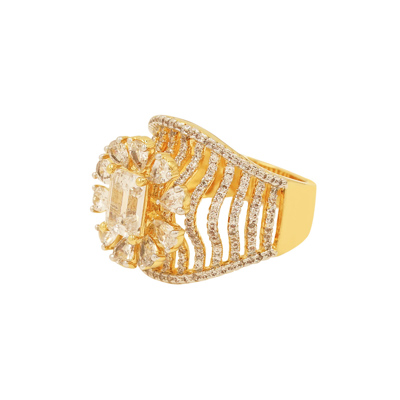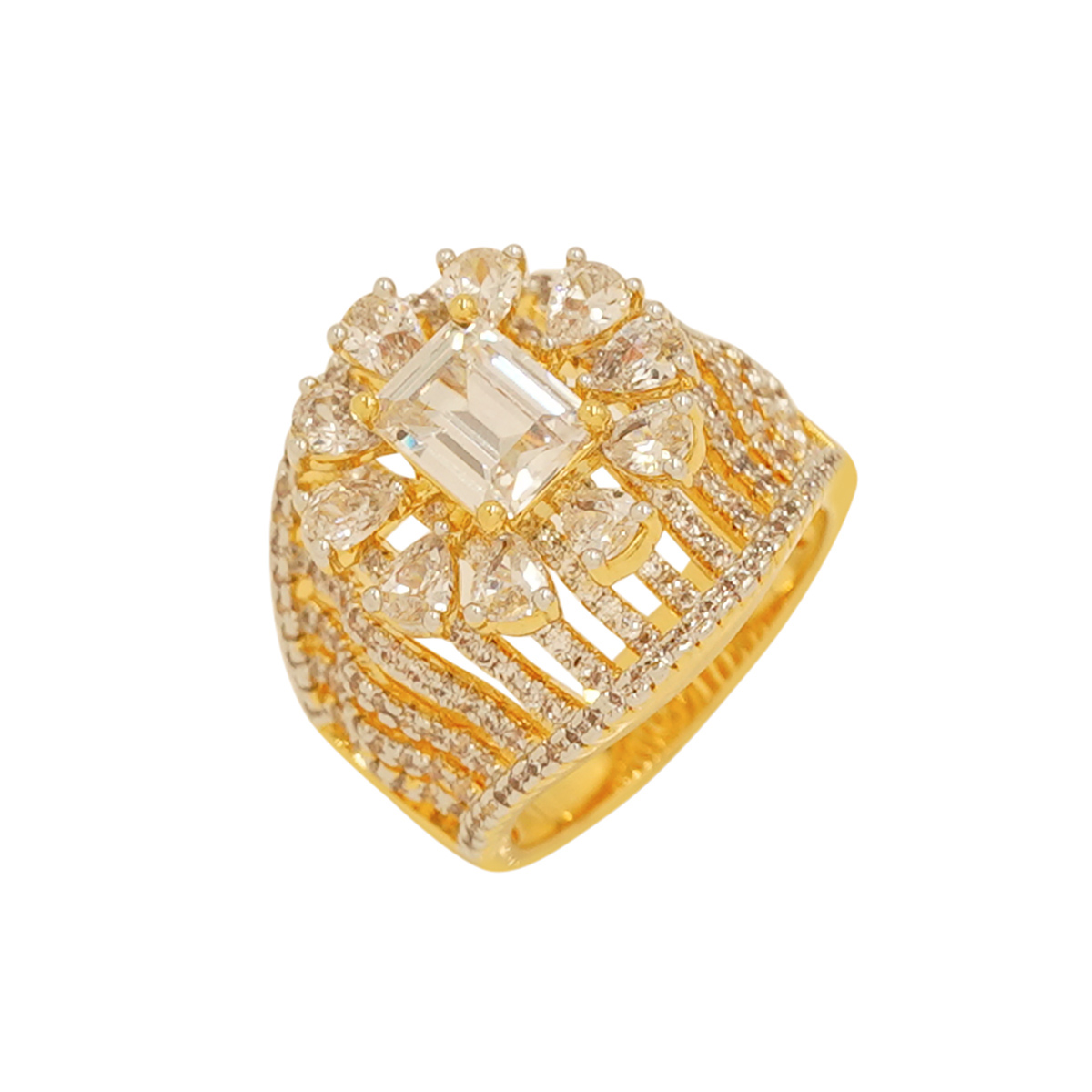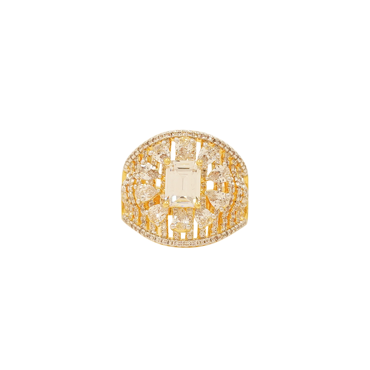 DESCRIPTION - This luxurious ring features a dazzling emerald-cut cubic zirconia surrounded by pear-shaped CZ stones in a crown-inspired design. Its grand, shimmering look makes it perfect for weddings, parties, and bold festive styling. A true statement piece that radiates elegance and royalty.