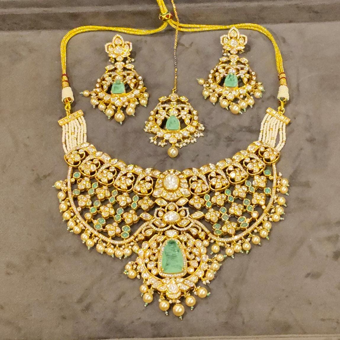 DESCRIPTION - This luxurious bridal necklace set showcases intricate craftsmanship with elegant green accents, pearl detailing, and ornate patterns. Perfect for weddings, festive events, and cultural occasions, this set adds unmatched grace and royal splendor to your traditional look.